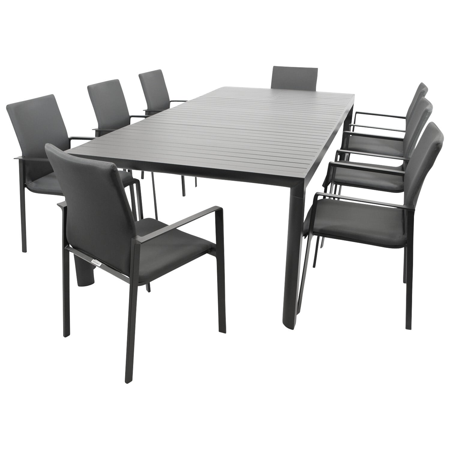 Garnitur 9-teilig bestehend aus 8x Stapelsessel, Gestell aus pulverbeschichtetem Aluminium, Farbe anthrazit, Sitzfläche + Rückenlehne Kunstgewebe anthrazit mit Quick Dry Foam, 1x XL-Ausziehtisch 195/255x120cm mit Butterfly-Auszug, Gestell aus pulverbeschichtetem Aluminium, Farbe anthrazit + Tischplatte aus Alu-Latten anthrazit.