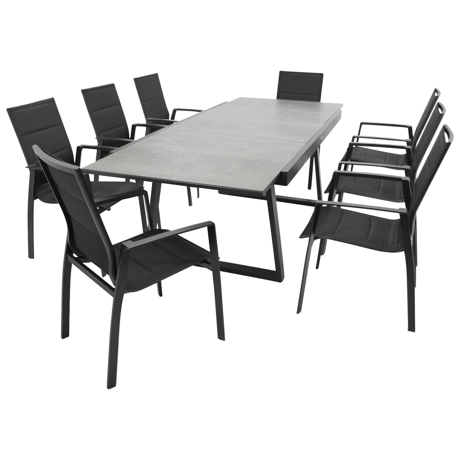 Garnitur 9-teilig bestehend aus 8x Stapelsessel, Gestell aus pulverbeschichtetem Aluminium, Farbe anthrazit, Sitzfläche + Rückenlehne Kunstgewebe schwarz mit Polsterung, 1x Ausziehtisch 180/240x100cm, Kufengestell aus pulverbeschichtetem Aluminium, Farbe anthrazit + Tischplatte aus Glas in Keramikoptik grau.