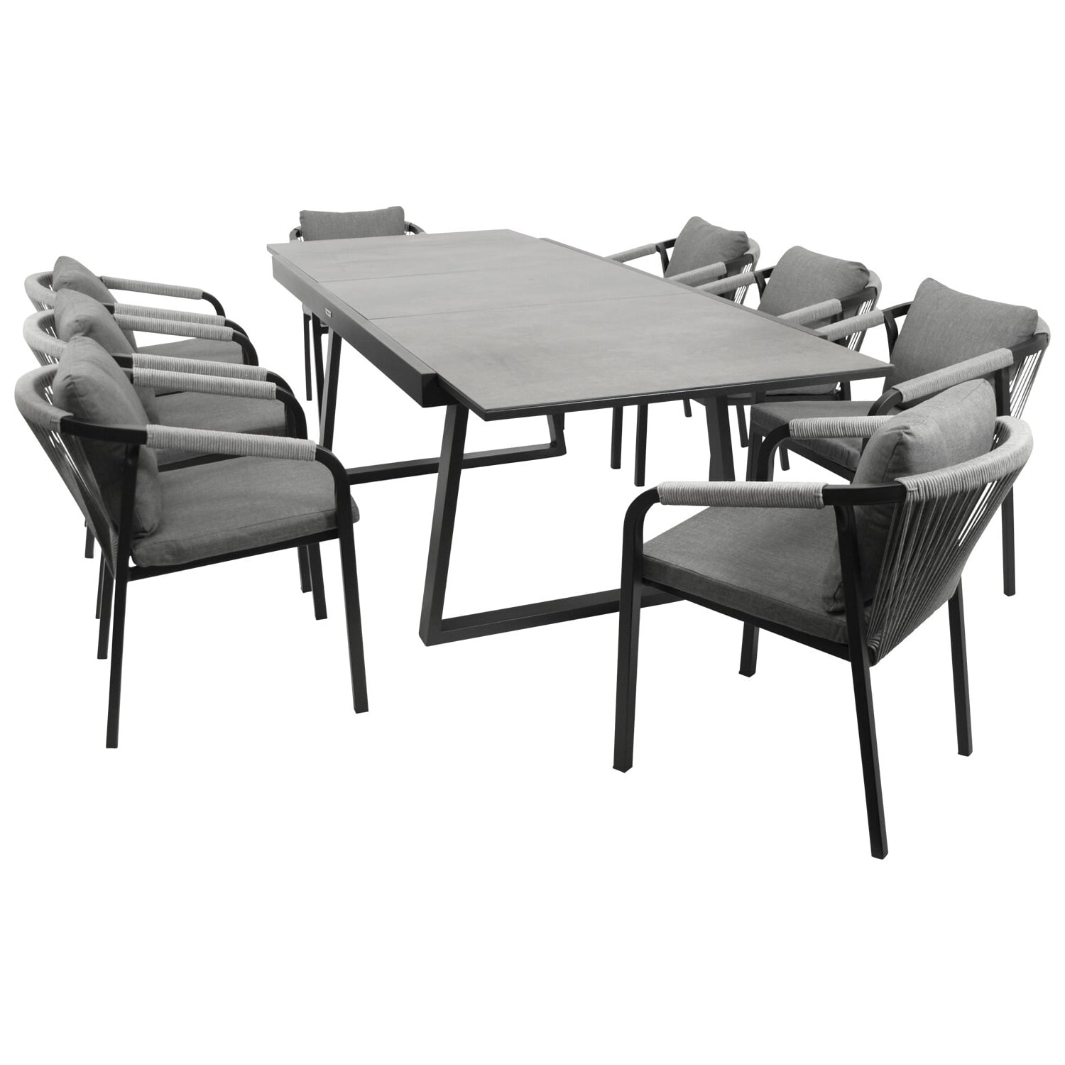 Garnitur 9-teilig bestehend aus 8x Stapelsessel, Gestell aus pulverbeschichtetem Aluminium, Farbe anthrazit, Rückenlehne aus Rope grau, mit Sitz- und Rückenkissen, Materialzusammensetzung Bezüge: 100% Polyester, 1x Ausziehtisch 180/240x100cm, Kufengestell aus pulverbeschichtetem Aluminium, Farbe anthrazit + Tischplatte aus Glas in Keramikoptik grau.
