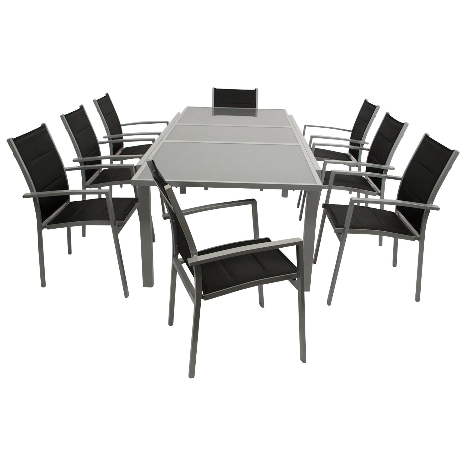 Garnitur 9-teilig (8x Stapelsessel mit Aluminiumgestell, Bespannung Textillehne schwarz, Ausziehtisch 180/240x100cm, Aluminium + Glas).