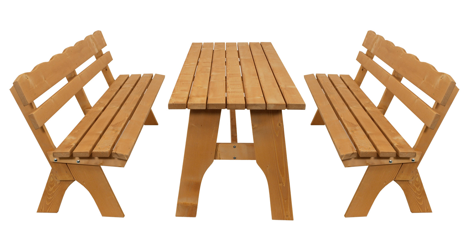 – Farbe: natur, – Im Set enthalten: 2 Bänke + 1 Tisch, – Maße: Tisch 200x70x72cm, Bank 200x60x82cm, – Material: Kiefer massiv, – Produktart: Garnitur