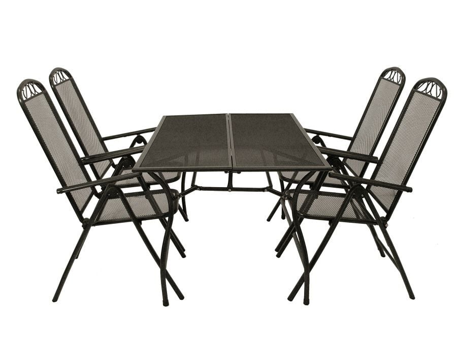 Die bequemen Klappsessel verfügen über eine extra hohe 5-fach verstellbare Rückenlehne. Der großzügige Tisch bietet bequem Platz für vier Personen. Alle Teile sind im Spezialverfahren anthrazitfarben beschichtet.