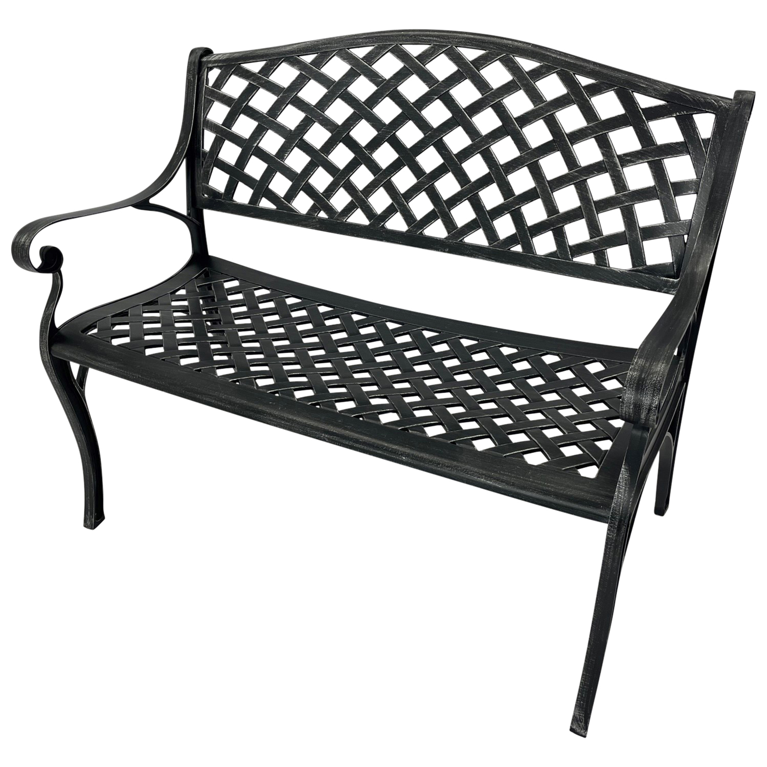 Gartenbank 2-sitzer aus Aluguss, antik-grau lackiert. Kreuzmuster in Sitz- und Rückenteil. Material wetterfest und rostfrei.
