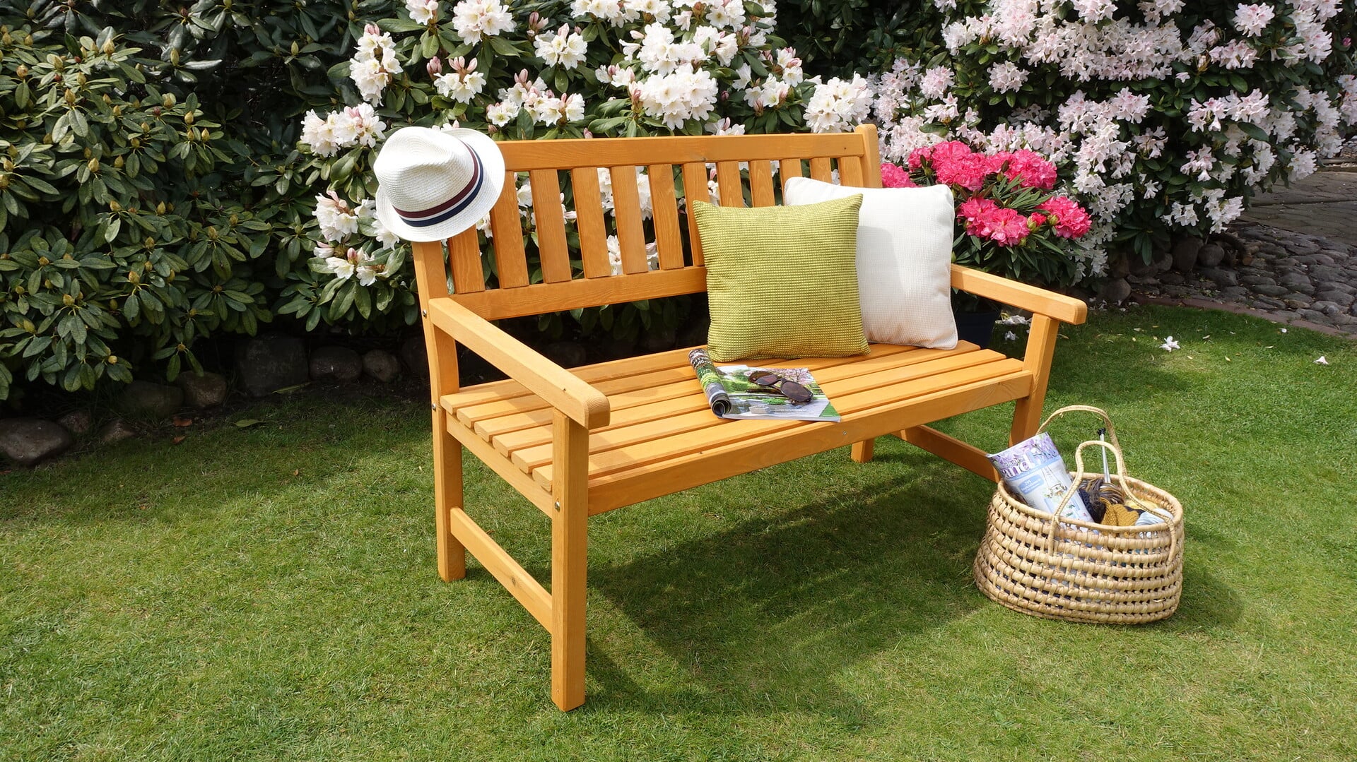 Genießen Sie Ihren Kaffee in der Sonne auf dieser 2-Sitzer Gartenbank aus Kiefernholz.