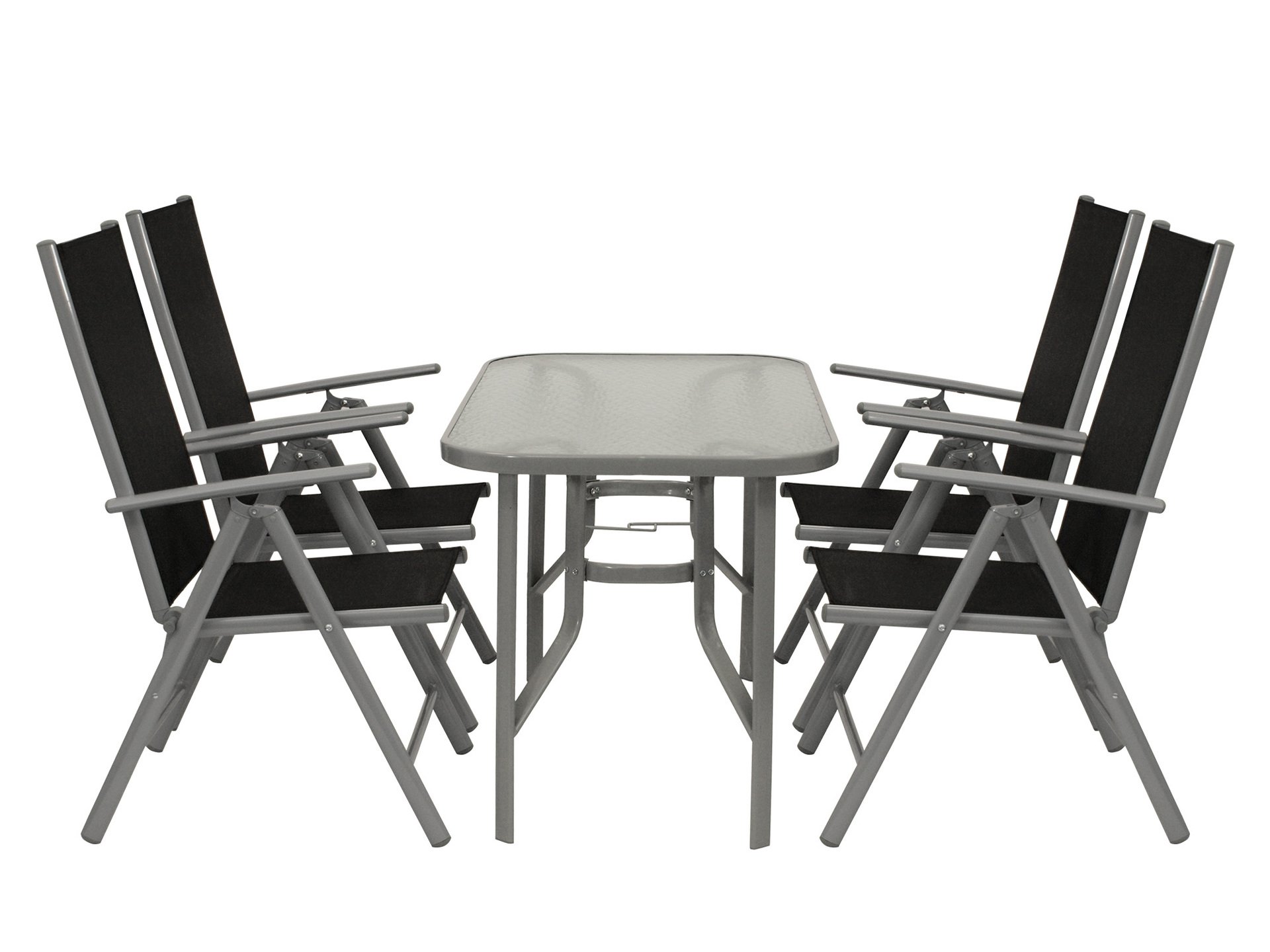 Garnitur 5-teilig (4x Klappsessel mit Armlehnen, 1x Tisch 70x120cm), Gestell Aluminium / Stahl grau, Bezug Kunstgewebe schwarz, Tischplatte Glas