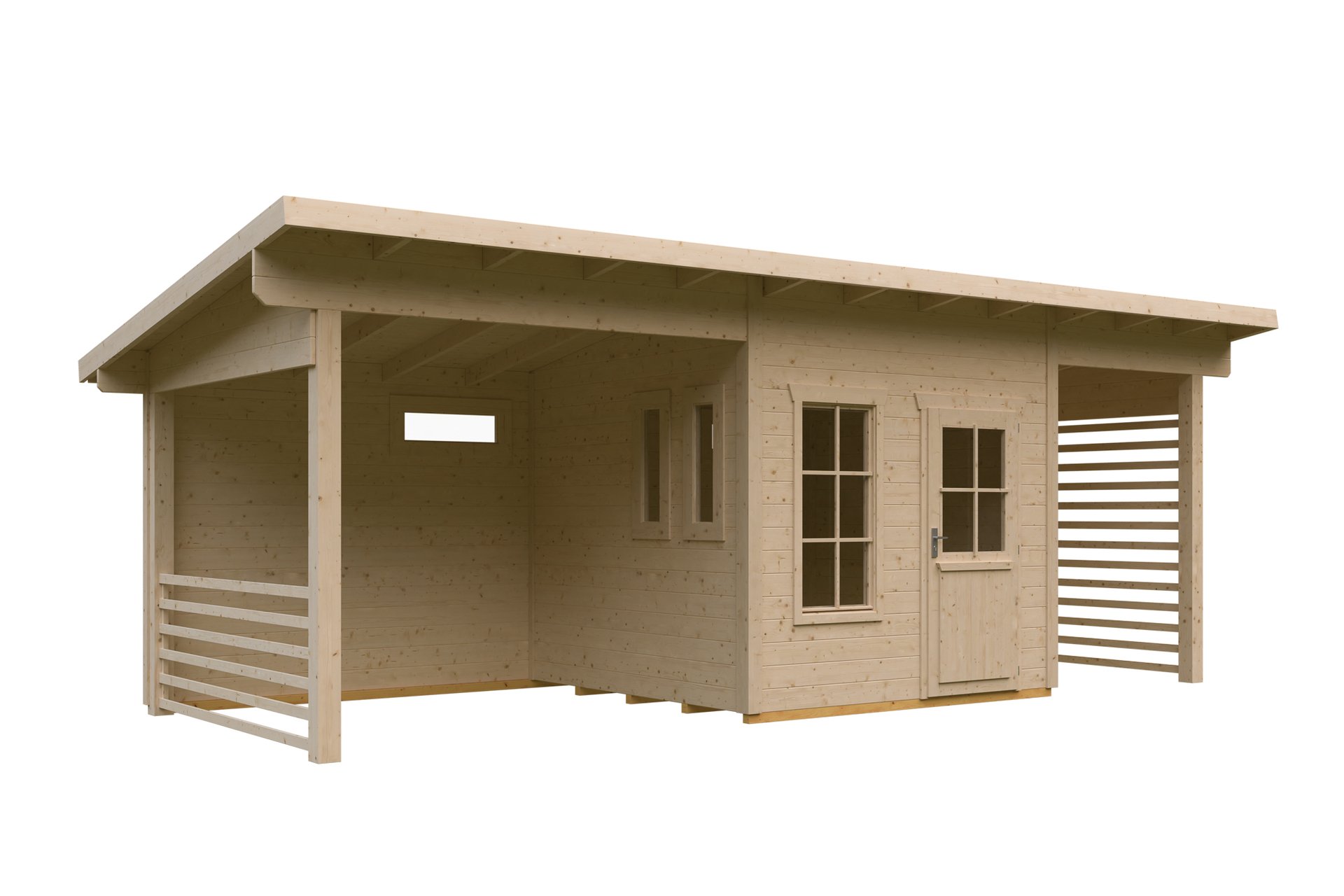 Das Dach besteht aus 19 mm Dachschalung. Aufgrund der geringen Dachneigung ist eine Eindeckung mit Dachschindeln nicht möglich. Wir empfehlen die Eindeckung mit KSK-M Dachbahnen (sind optional als Zubehör erhältlich). Das Gefälle verläuft nach hinten.