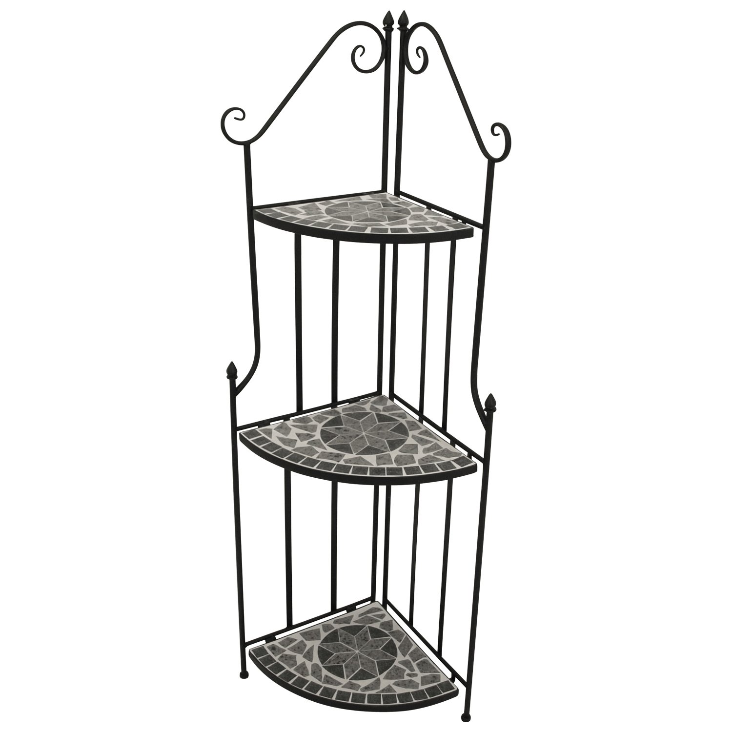 Eck-Regal für Innen und Außen. Rahmen aus Stahl, Regalebenen aus echter Keramik in Mosaik Optik, Farbe grau.