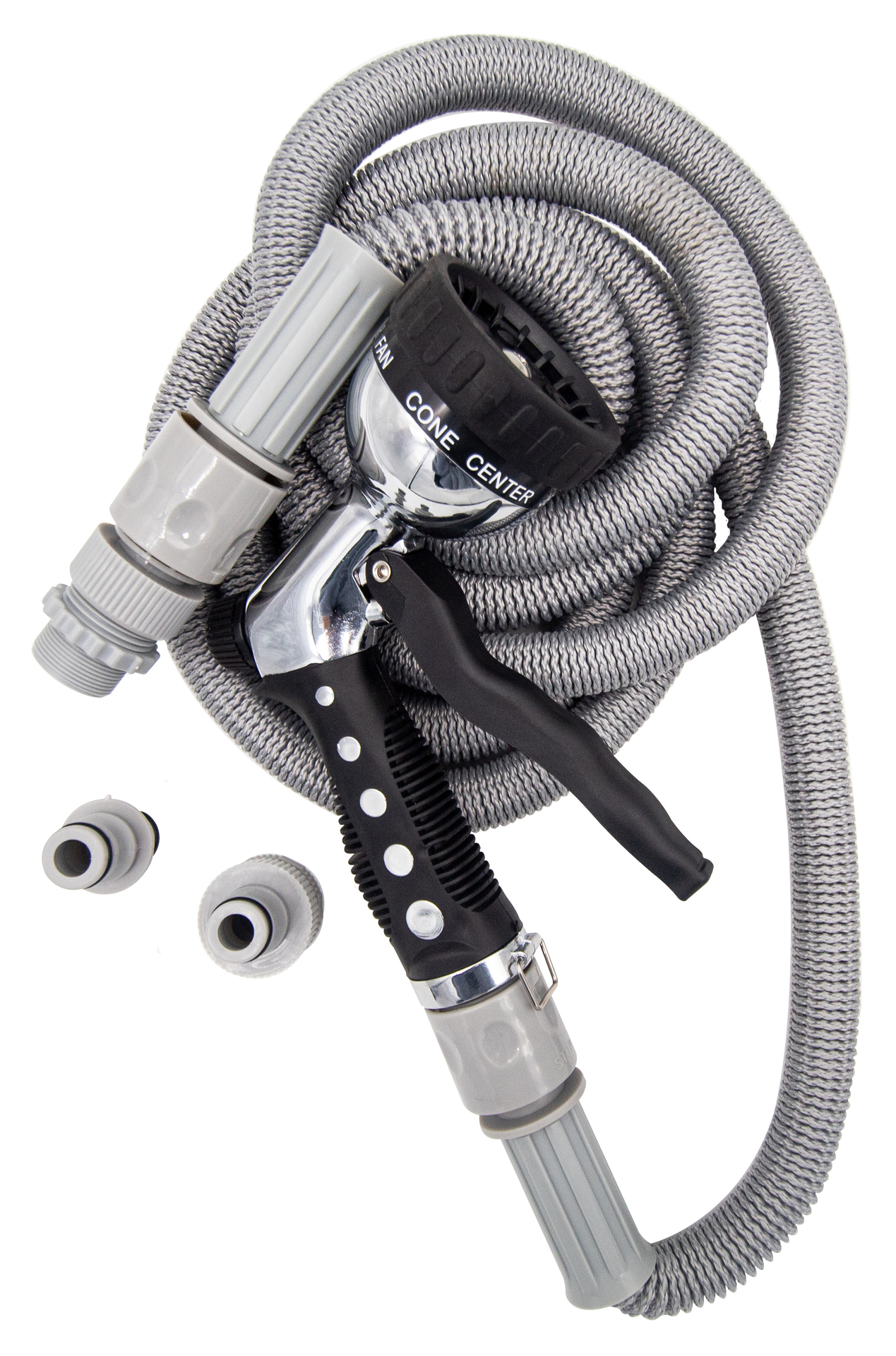 Der TÜV geprüfte, flexible Gartenschlauch verfügt über 8 Sprühfunktionen und ist enorm dehnbar durch Wasserdruck. Berstdruck betrögt ca. 12 bar. Die Brause besteht aus edelem Metall mit einem Soft-Touch-Griff. Der Gartenschlauch enthält zusätzlich Kunststoffarmaturen und Adapter für eine leichte Anwendung. Dehnbar von ca. 7,5 Meter auf 22,5 Meter