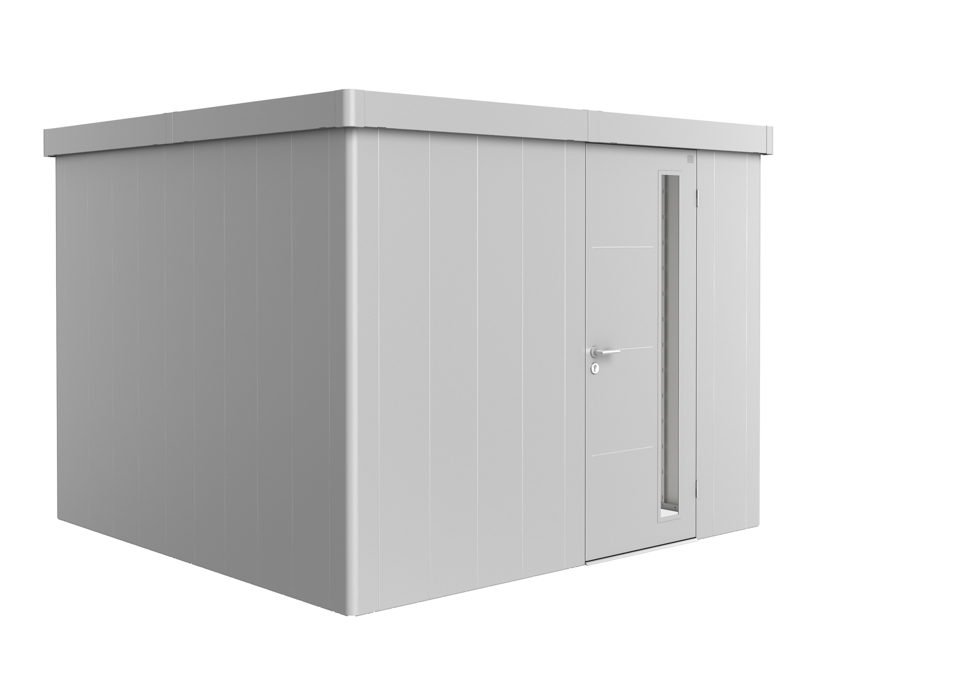 Das Gerätehaus Neo prägt mit der glatten Wandoberfläche und dem eleganten Lichband in der Tür den modernen Look. Für angenehme Atmosphäre sorgen neben der Holzuntersicht zur Luftfeuchte-Regulierung die optionale Innenwandverkleidung in Weiß und die optionale Isolierung. Es ist ein- oder zweifärbig erhältich (für die Tür und das Dach kann ohne Aufpreis eine Zweitfarbe gewählt werden). Stabile Dachkonstruktion für bis zu 150 kg/m² Schneelast, Sturmsicherheit bis Windstärke 12.