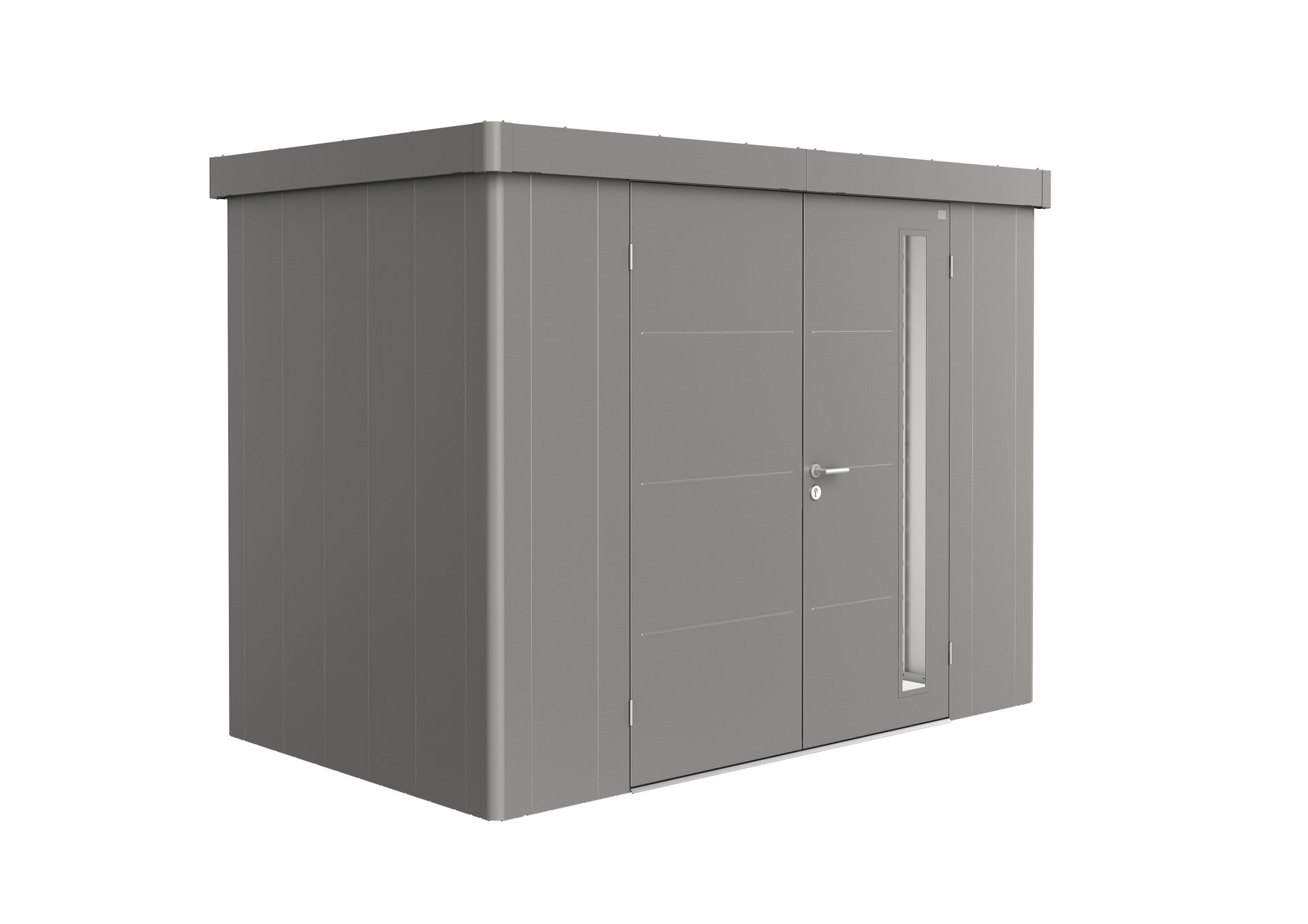 Das Gerätehaus Neo prägt mit der glatten Wandoberfläche und dem eleganten Lichband in der Tür den modernen Look. Für angenehme Atmosphäre sorgen neben der Holzuntersicht zur Luftfeuchte-Regulierung die optionale Innenwandverkleidung in Weiß und die optionale Isolierung. Es ist ein- oder zweifärbig erhältich (für die Tür und das Dach kann ohne Aufpreis eine Zweitfarbe gewählt werden). Stabile Dachkonstruktion für bis zu 150 kg/m² Schneelast, Sturmsicherheit bis Windstärke 12.