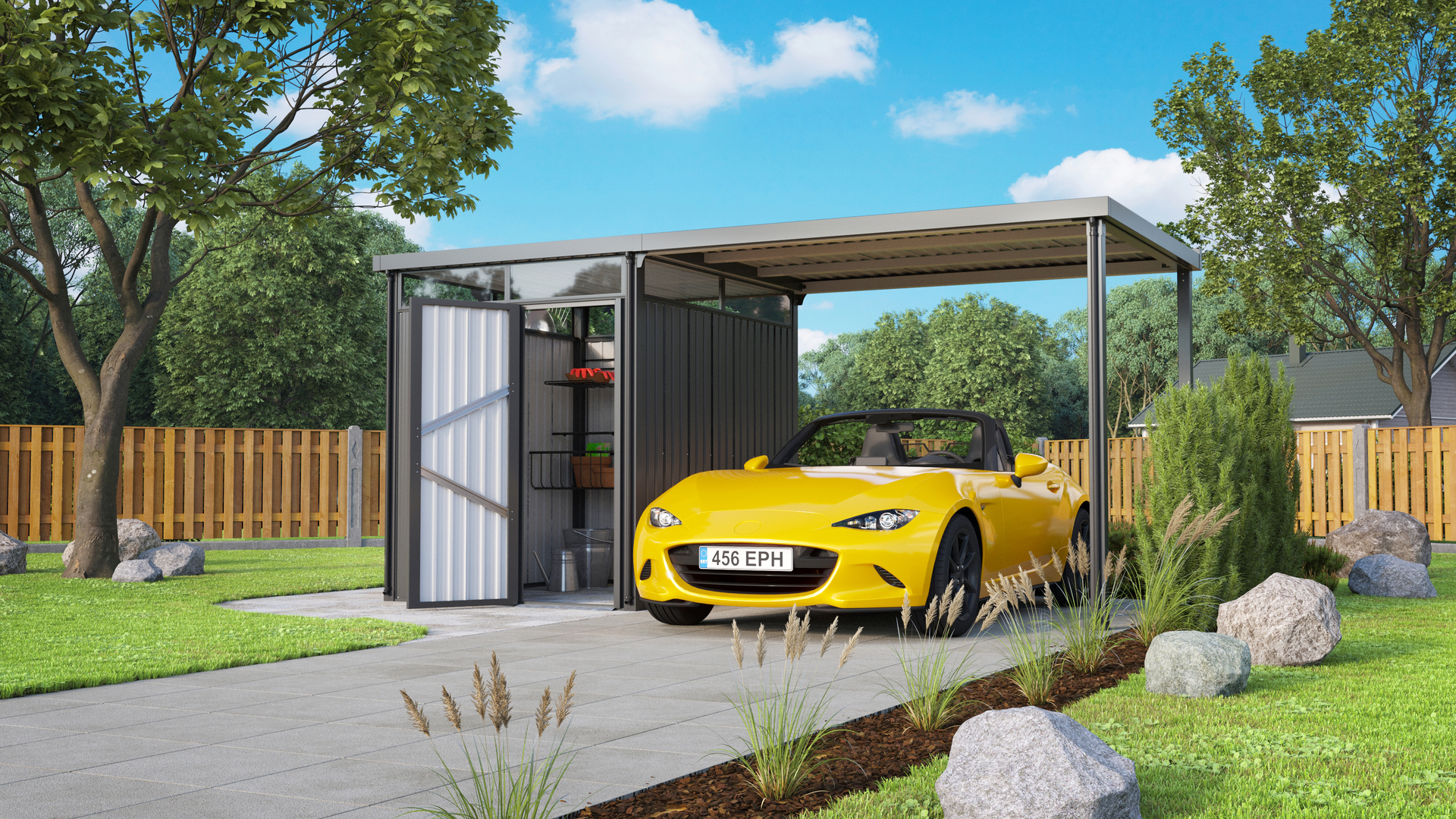 Wände, Dach und Bodenrahmenteile aus galvanisiertem Stahlblech sind durch eine zusätzliche Polyesterlackierung zuverlässig vor Rost und Kratzern geschützt. Die nach Außen öffnenden Schwingtüren verleihen dem Haus wohnlichen Charakter und sparen Platz im Inneren. Zusätzlichen Stauraum schafft das zusätzliche Schleppdach, das in diesem Set enthalten ist. Es erweitert den überdachten Bereich um weitere 6,63 Quadratmeter: Perfekt für Fahrräder und alle Dinge, für die der trockene Platz und der schnelle Zugriff ähnlich wichtig sind.