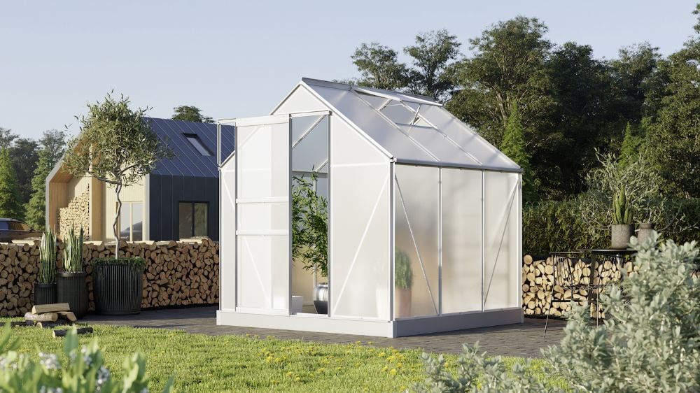 Gewächshaus 5000/4DT – Die Eindeckung aus Hohlkammerplatten (HKP) sorgt für solide Isoliereigenschaften. Sie federn Temperatureinbrüche wie zu Saisonbeginn und besonders nachts ab, aber schützen die Pflanzen auch vor zu intensiver Sonneneinstrahlung. So müssen sich Einsteiger um beides nur bedingt kümmern, wenn das Gewächshaus richtig eingedeckt ist. Im Vergleich zu Glas sind Hohlkammerplatten zudem bruchsicherer und leichter. Das aufstellbare Dachfenster gewährt eine optimale Belüftung, vor allem an heißen Tagen. Neben den Dachfenstern gehören auch die Regenrinnen zur Standardausstattung. Für den ebenerdigen und rechtwinkligen Aufbau des Gewächshauses ist ein Fundamentrahmen (H 12,5 cm) aus verzinktem Stahlblech besonders hilfreich (Zusatzartikel nicht im Lieferumfang enthalten).