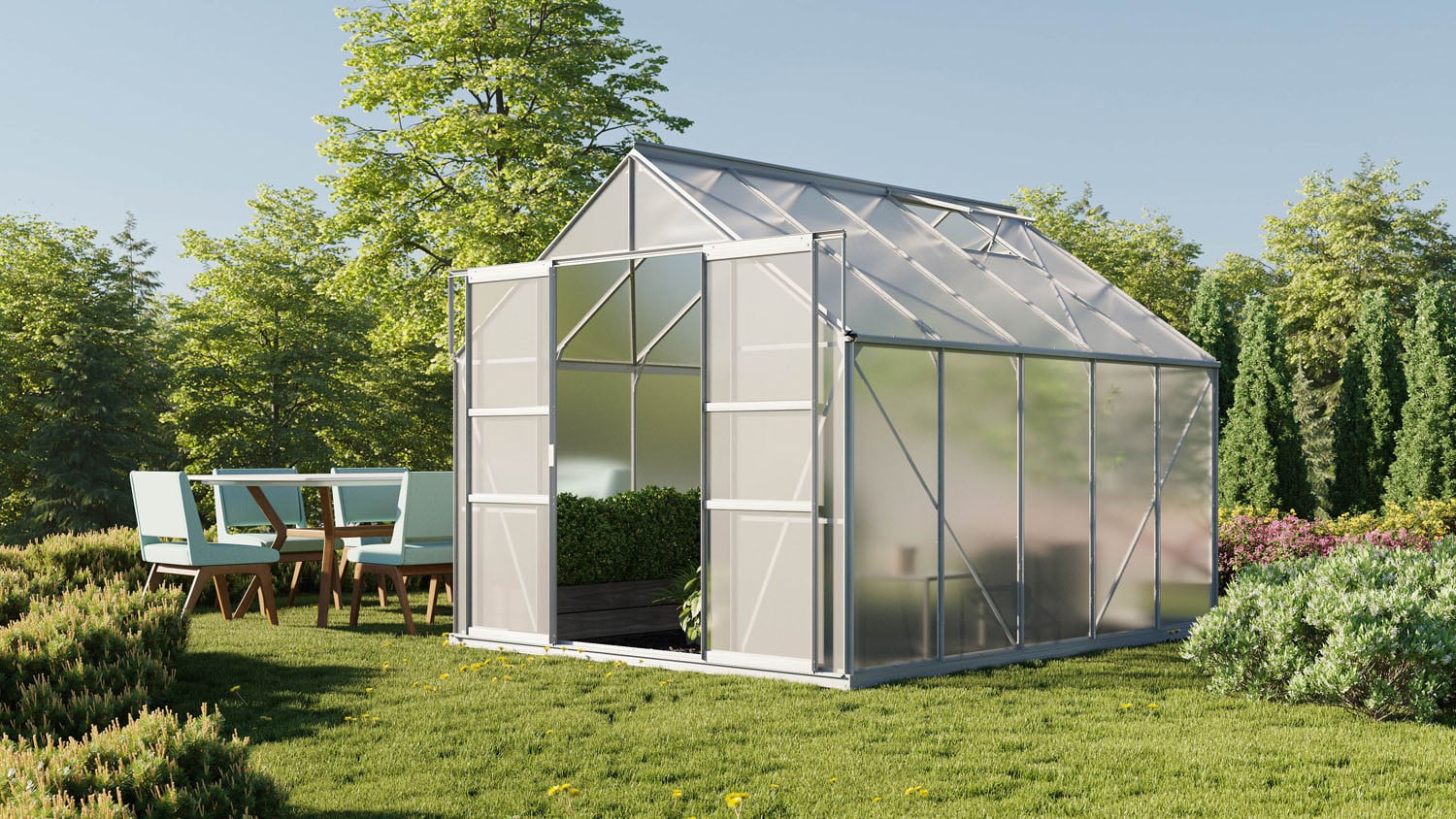 Gewächshaus 8300/6 Dt – Die Eindeckung aus Hohlkammerplatten (HKP) sorgt für solide Isoliereigenschaften. Sie federn Temperatureinbrüche wie zu Saisonbeginn und besonders nachts ab, aber schützen die Pflanzen auch vor zu intensiver Sonneneinstrahlung. So müssen sich Einsteiger um beides nur bedingt kümmern, wenn das Gewächshaus richtig eingedeckt ist. Im Vergleich zu Glas sind Hohlkammerplatten zudem bruchsicherer und leichter. Das aufstellbare Dachfenster gewährt eine optimale Belüftung, vor allem an heißen Tagen. Neben den Dachfenstern gehören auch die Regenrinnen zur Standardausstattung. Für den ebenerdigen und rechtwinkligen Aufbau des Gewächshauses ist ein Fundamentrahmen (H 12,5 cm) aus verzinktem Stahlblech besonders hilfreich (Zusatzartikel nicht im Lieferumfang enthalten).