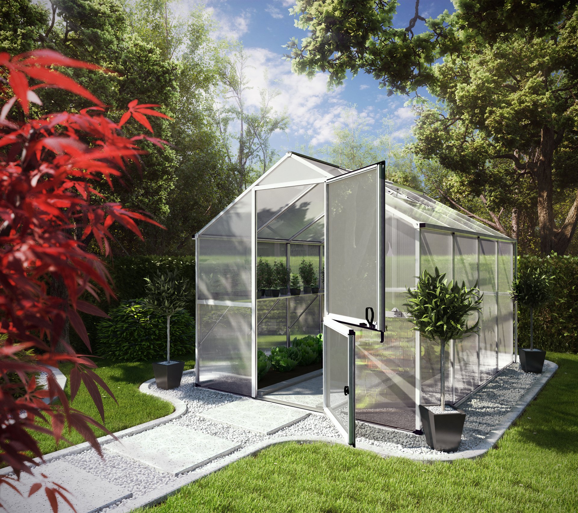 Das KGT Gewächshaus Callas IV (Farbe: Aluminium pressblank), mit den Maßen 2,27 x 3,00 m, ist das perfekte Einsteigermodell in die Gewächshauswelt. Neben der breiten, abschließbaren, geteilten Drehtür verfügt das Gewächshaus zusätzlich über ein Dachfenster mit automatischem Fensterheber, damit eine optimale Be- und Entlüftung Ihrer Pflanzen gewährleistet wird. Durch die Stehwandhöhe von 1,49 m und einer großzügigen Firsthöhe von 2,14 m ist jede Menge Raum zum Gärtnern vorhanden. So können auch Tomaten und Gurken problemlos in die Höhe wachsen und sich vollends entfalten. Die stabile Aluminium-Konstruktion sowie die transparenten, wärmeisolierenden 6 mm-starken ISO-Hohlkammerplatten aus hochbruchfestem Polycarbonat sorgen für beste Stabilität. Beidseitige Regenrinnen mit Abläufen sind ebenso vorhanden. Das Haus eignet sich ideal zur Aufzucht von Pflanzen im zeitigen Frühjahr.