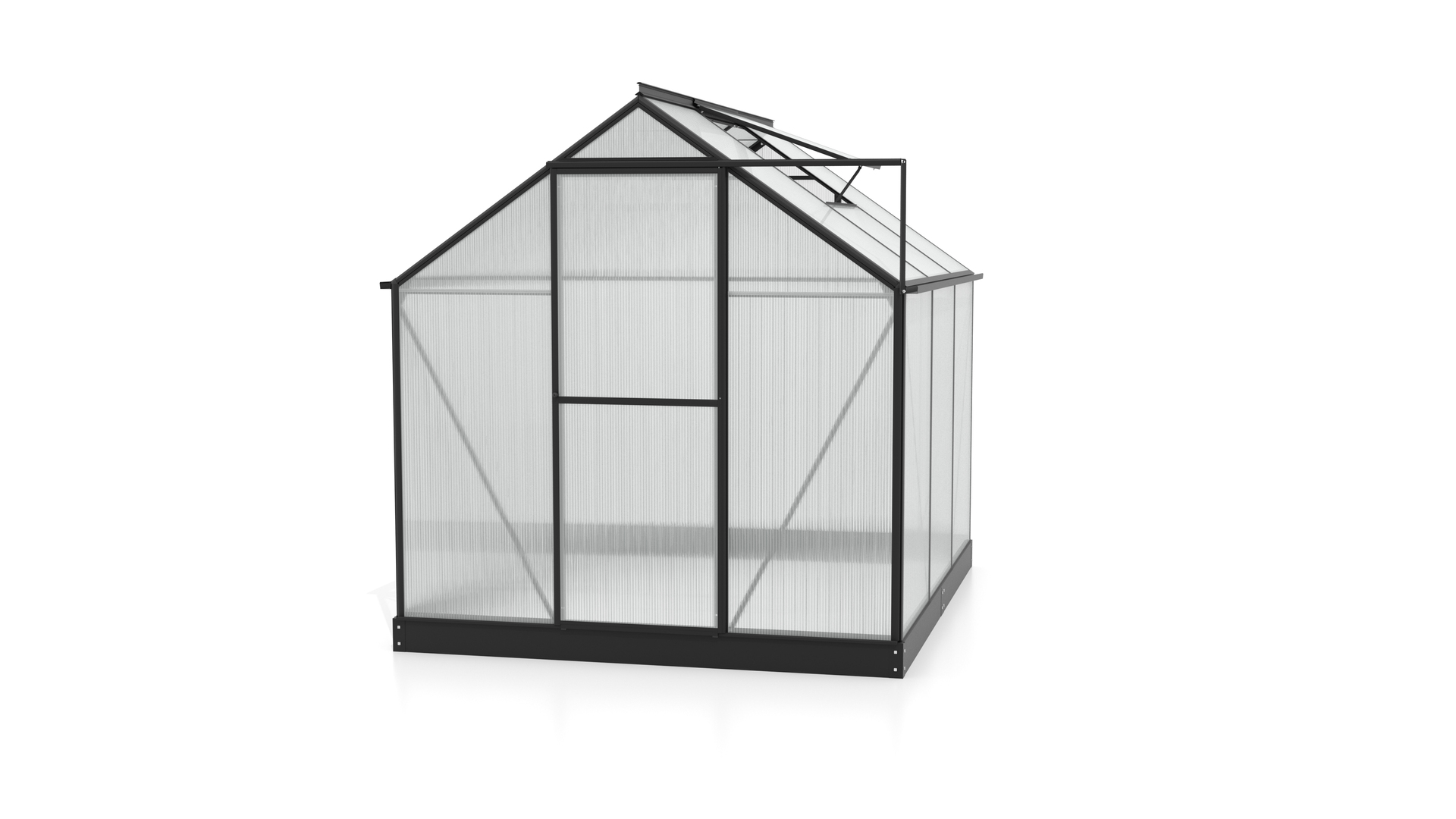 – Breite: 1977, – Farbe: schwarz, – Gewicht: 52,409, – Höhe: 1359, – Länge: 2285, – Material: Aluminium, Polycarbonat, Stahl, – Produktart: Gewächshausset