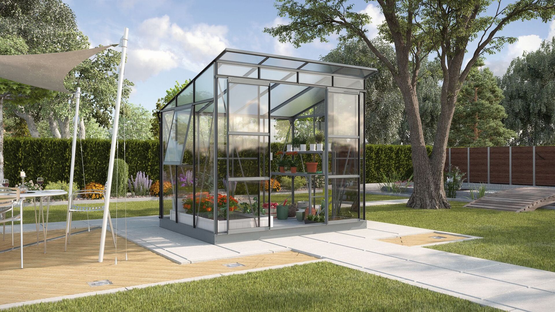 Mit diesem Gewächshaus setzen Sie architektonische Akzente in Ihrem Garten. Konzipiert mit einem Pultdach, breiter Front und hohen Seitenwänden besticht es durch ein großzügiges Design. Das Modell ist in zwei verschiedenen Größen mit den Grundflächen 5,9 und 7,6 m², in zwei Verglasungsartungen und in zwei Farben erhältlich: Aluminium eloxiert oder Anthrazit pulverbeschichtet. Die Kombiverglasung besteht in den Seiten aus ca. 3 mm starkem Sicherheitsglas, kristallklar (ESG) und im Dachbereich aus ca. 6 mm starken Hohlkammerplatten (HKP). Diese schützen die Pflanzen gegen zu starke Sonneneinstrahlung, sorgen für eine ausgeglichene Temperatur und sind weniger empfindlich gegen herabfallende Äste oder dergleichen. Das leicht geneigte Dach lässt viel Sonne in das Gewächshaus. Mit Seitenwänden und -fenstern aus Hohlkammerplatten kann das Freya in seinen Isoliereigenschaften optimiert werden, empfehlenswert z.B. bei einem geplanten Einsatz im Winter. Der geringe Höhenunterschied des Pultdachs gewährleistet durchgehend eine angenehme Stehhöhe und bietet hochwachsenden Pflanzen genügend Raum sich frei zu entfalten. Ein bis zwei aufstellbare Seitenfenster geben dem Haus wohnliches Flair. Die leichtgängige, breite Doppelschiebetür mit einer Breite von 1,22 m und einer Höhe von 1,92 m bietet großzügigen Zugang und eine zusätzliche Belüftungsmöglichkeit. Die Regenrinne und zwei Regenfallrohre (L 1,50 m, Ø 32 mm) gehören ebenfalls zur Standardausstattung. Das Modell 7600 ist zusätzlich mit einem Lamellenfenster ausgestattet. Das Gerüst besteht aus schmalen Aluminiumleisten. Da Aluminium ein extrem stabiles und widerstandsfähiges Material ist, genügen die feinen Leisten um langfristig für einen stabilen Stand zu sorgen. So ist Ihnen andauernde Freude an Ihrem Gewächshaus garantiert.