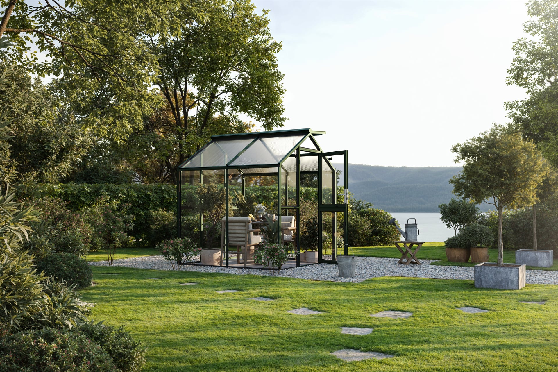 Das innovative Aluminium-Gewächshaus Galant eignet sich mit der Breite von ca. 2,16 m perfekt für den Kleingarten oder Schrebergarten. Mit einer Traufhöhe von ca. 1,72 m ist genügend Raum vorhanden, um der Kreativität freien Lauf zu lassen. Es fungiert z.B. als reines Gewächshaus, zur Anzucht von Pflanzen, Gemüse etc. oder als grüne Oase zur Entspannung. Selbstverständlich bietet sich auch eine Kombination aus beidem an. Damit sich das Gewächshaus optimal in den Garten einfügen lässt, stehen drei Farbausführungen zur Auswahl. Die pressblanke Aluminium-Ausführung sowie den pulverbeschichteten Profilsystemen in tannengrün oder anthrazit-grau. Zur Grundausstattung gehört neben den zwei Dachfenstern (bei Typ 2 = ein Dachfenster) mit automatischen Fensteröffnern, eine geteilte Drehtür mit abschließbarem Türdrücker. Die Tür lässt sich im geöffneten Zustand mittels starken Magneten am Gewächshaus fixieren. Zusammen sorgen diese beiden Komponenten für effektive Lüftungsmöglichkeiten und ein gutes Klima im Gewächshaus. Des Weiteren gehören zum Lieferumfang beidseitig große Regenrinnen, inkl. Aluminium-Fallrohren, mit denen das Regenwasser gezielt umgeleitet werden kann. Die Verglasung im Giebel- und Traufbereich sind je nach Nutzungsabsicht wählbar (ISO-Hohlkammerplatten 10 mm oder Echtglas 4 mm ESG). Für die ideale Innenraum-Nutzung des Gewächshauses bieten wir, wie bei den anderen Gewächshaus-Modellen auch, passende Regale, Pflanztische und Hängeborde an. Um das Gewächshaus idealerweise zu gründen, empfiehlt sich der Fundamentrahmen aus Aluminium, der ebenfalls als Zubehör erhältlich ist. Sie sehen schon – Wir werden allen Ansprüchen gerecht.