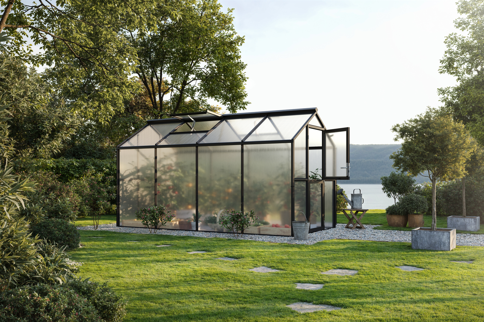 Das innovative Aluminium-Gewächshaus Galant eignet sich mit der Breite von ca. 2,16 m perfekt für den Kleingarten oder Schrebergarten. Mit einer Traufhöhe von ca. 1,72 m ist genügend Raum vorhanden, um der Kreativität freien Lauf zu lassen. Es fungiert z.B. als reines Gewächshaus, zur Anzucht von Pflanzen, Gemüse etc. oder als grüne Oase zur Entspannung. Selbstverständlich bietet sich auch eine Kombination aus beidem an. Damit sich das Gewächshaus optimal in den Garten einfügen lässt, stehen drei Farbausführungen zur Auswahl. Die pressblanke Aluminium-Ausführung sowie den pulverbeschichteten Profilsystemen in tannengrün oder anthrazit-grau. Zur Grundausstattung gehört neben den zwei Dachfenstern (bei Typ 2 = ein Dachfenster) mit automatischen Fensteröffnern, eine geteilte Drehtür mit abschließbarem Türdrücker. Die Tür lässt sich im geöffneten Zustand mittels starken Magneten am Gewächshaus fixieren. Zusammen sorgen diese beiden Komponenten für effektive Lüftungsmöglichkeiten und ein gutes Klima im Gewächshaus. Des Weiteren gehören zum Lieferumfang beidseitig große Regenrinnen, inkl. Aluminium-Fallrohren, mit denen das Regenwasser gezielt umgeleitet werden kann. Die Verglasung im Giebel- und Traufbereich sind je nach Nutzungsabsicht wählbar (ISO-Hohlkammerplatten 10 mm oder Echtglas 4 mm ESG). Für die ideale Innenraum-Nutzung des Gewächshauses bieten wir, wie bei den anderen Gewächshaus-Modellen auch, passende Regale, Pflanztische und Hängeborde an. Um das Gewächshaus idealerweise zu gründen, empfiehlt sich der Fundamentrahmen aus Aluminium, der ebenfalls als Zubehör erhältlich ist. Sie sehen schon – Wir werden allen Ansprüchen gerecht.