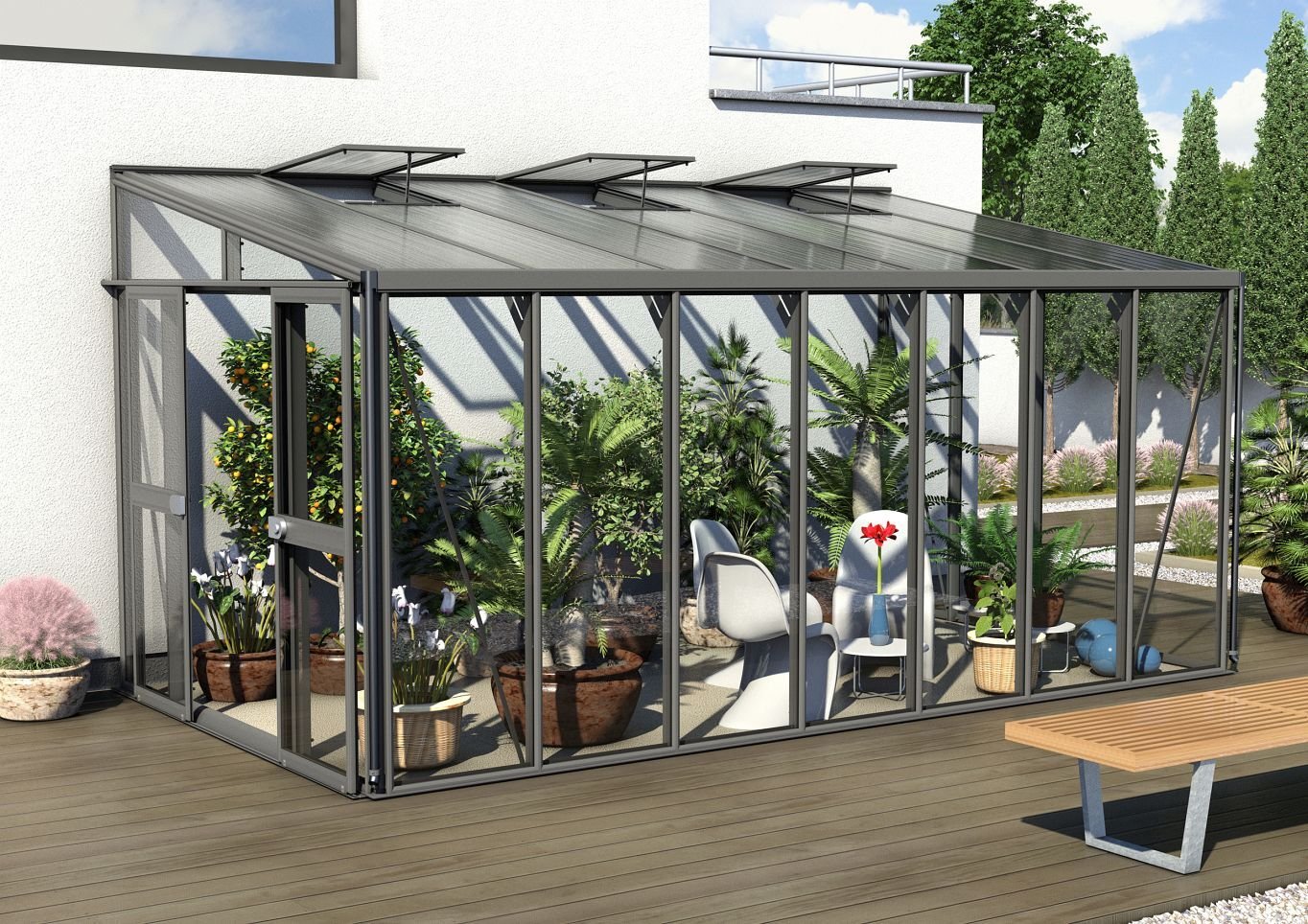 Ob zum Überwintern von Pflanzen oder als Anlehngewächshaus mit schönem Ausblick: Das großzügige Modell bietet genug Platz für Ihr Gemüse, frostempfindliche Pflanzen und auch für Sie!