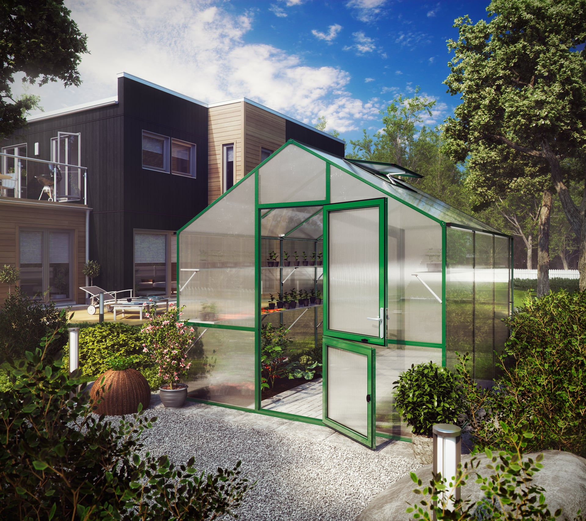 Das Aluminium- Gewächshaus Lilie (Farbe: moosgrün RAL 6005) wurde speziell für den anspruchsvollen Hobbygärtner entwickelt. Die transparenten ISO-Hohlkammerplatten haben eine Stärke von 10 mm und werden komplett von den Profilen umschlossen, so dass ein Herumfliegen der Platten ausgeschlossen ist. Es werden keine Klammern oder ähnliche Kleinteile zur Befestigung der Hohlkammerplatten verwendet. Die Verglasung trägt somit einen großen Teil zur Stabilität bei. Eine Beschattung ist grundsätzlich nicht erforderlich, da keine UV-Strahlen durch die Hohlkammerplatten eindringen und Ihre Pflanzen somit vor dem Verbrennen geschützt werden. Ein weiterer Vorteil der Hohlkammerplatten ist der hohe Isolierwert, durch den die nützliche Wärme länger im Gewächshaus gespeichert wird. Durch die Stehwandhöhe von 1,83 m und einer großzügigen Firsthöhe von 2,68 m ist jede Menge Raum für Sie und Ihre Pflanzen vorhanden. So können auch Tomaten und Gurken problemlos in die Höhe wachsen und sich vollends entfalten. Neben der geteilten Drehtür und dem Rückwandfenster mit Handaufsteller verfügt das Gewächshaus Lilie über ein Dachfenster mit automatischem Fensterheber. Damit wird eine optimale Be- und Entlüftung gewährleistet. Um zu sichern was Ihnen lieb ist, ist im Standard-Lieferumfang eine hochwertige, abschließbare Hoppe-Drückergarnitur enthalten. Das Design der einzigartigen Tür wird durch die leichtgängigen, innenliegenden Türscharniere abgerundet. Mit dem Standardlieferumfang erhalten Sie zusätzlich eine beidseitige Regenrinne mit Fallrohren (Länge: 1,40 m). Alle wichtigen Profile (First-, Rinnen- und Bodenprofile) sind in einem Stück ausgeführt und sorgen für extra hohe Stabilität. Potenzielle Leckagen werden somit ebenfalls vermieden.