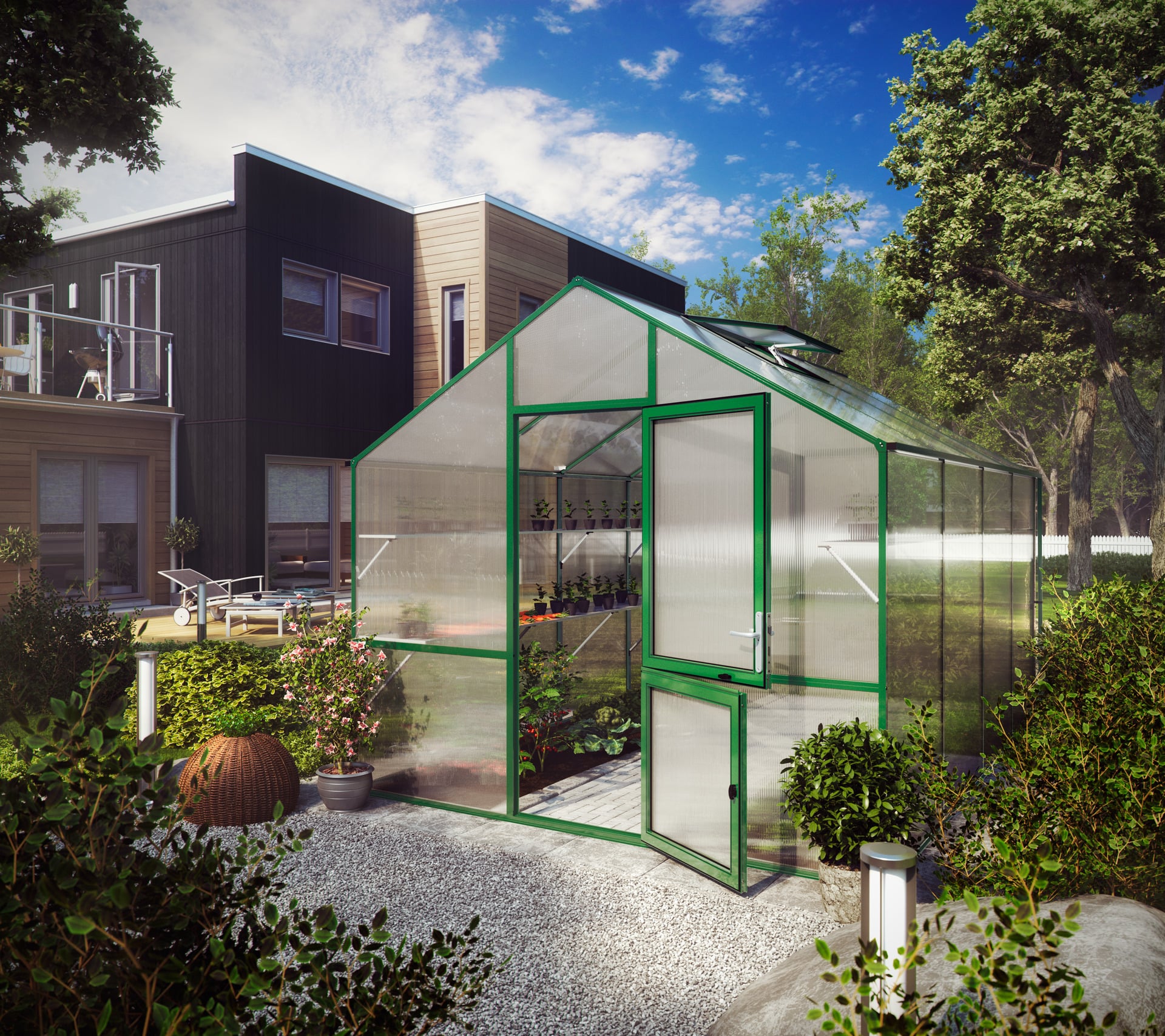 – Breite: 2,97, – Dach: Satteldach, – Farbe: moosgrün, – Fenster: 2,0, – Firsthöhe: 2680mm, – Fläche: 12,74m², – Höhe: 2,68, – Länge: 4,29, – Material: Aluminium, – Produktart: Gewächshaus, – Schließung: Profilzylinder, – Türart: Geteilte Drehtür (abschließbar)
