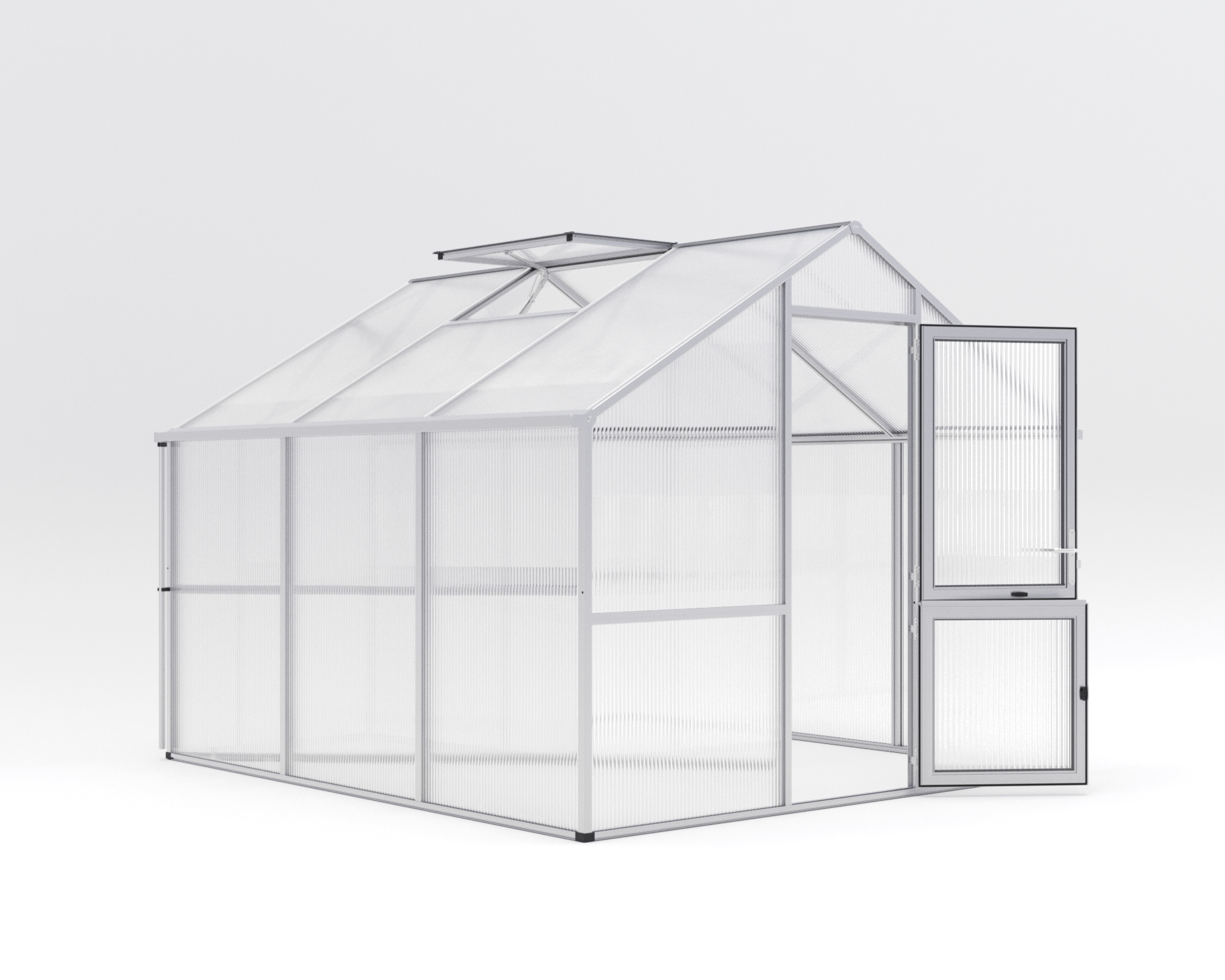 – Breite: 2,97, – Gewicht: 189, – Höhe: 2,44, – Länge: 3,23, – Material: Aluminium, – Produktart: Gewächshaus