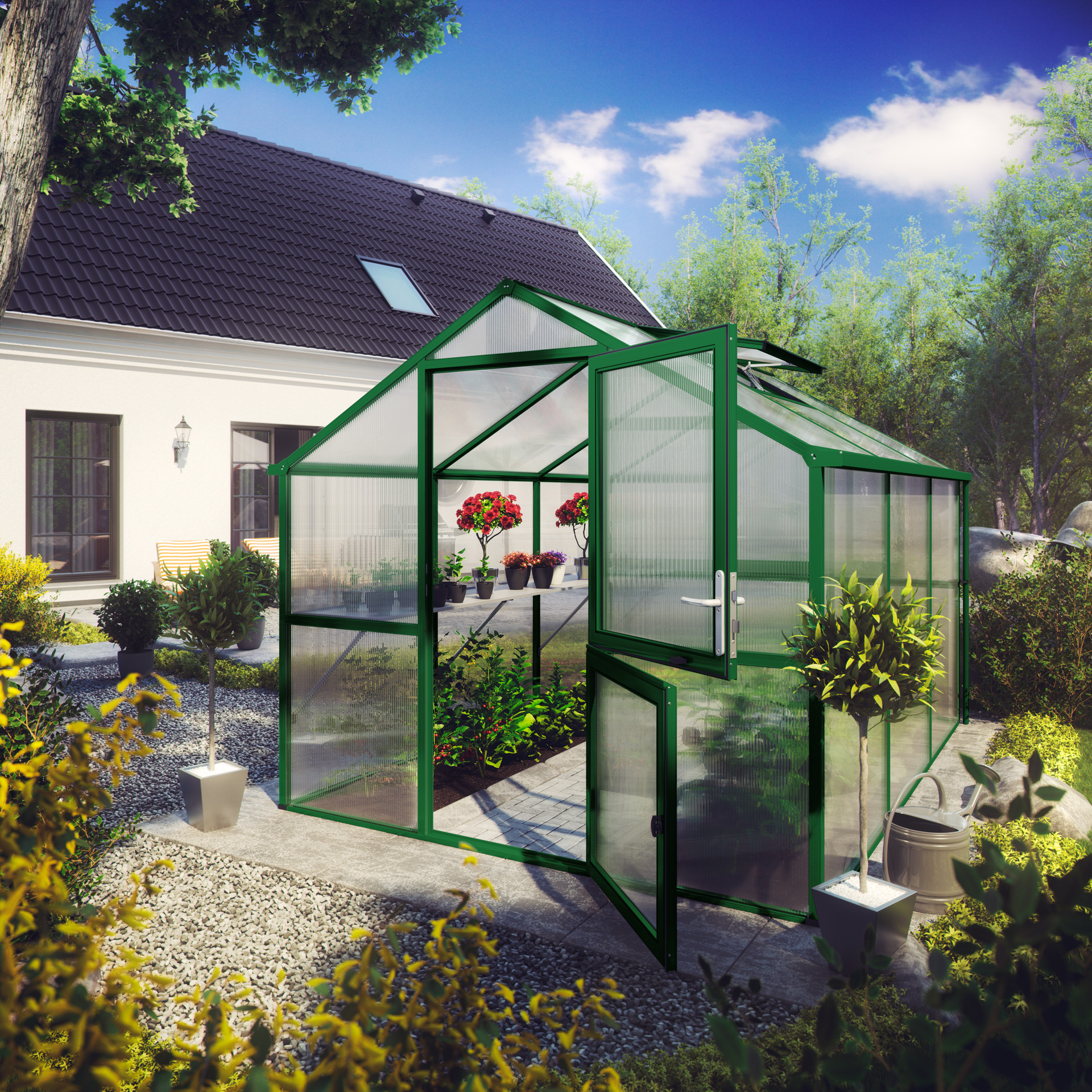 – Material: Aluminium, – Produktart: Gewächshaus, – Schließung: Profilzylinder, – Türart: Geteilte Drehtür (abschließbar), – Fenster: 2,0, – Farbe: moosgrün, – Fläche: 7,53m², – Höhe: 2,15, – Breite: 2,33, – Länge: 3,23, – Dach: Satteldach, – Firsthöhe: 2150mm