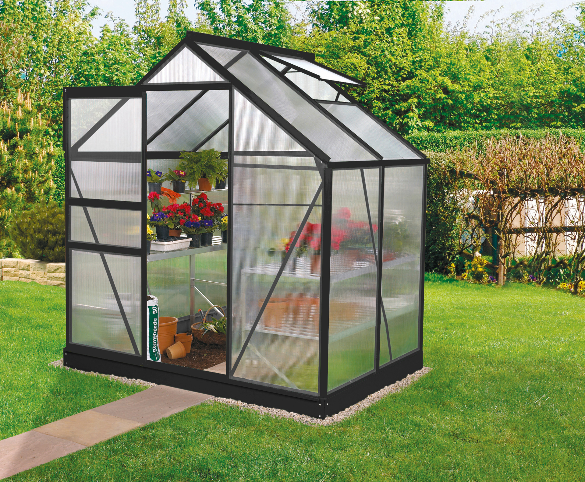 Das Modell ist in vier verschiedenen Größen mit den Grundflächen von 2,5 bis 6,2 m² und in zwei Farben erhältlich: Aluminium eloxiert oder Smaragd (pulverbeschichtet). Bei der Verglasung kann zwischen Hohlkammerplatten (HKP) und Einscheibensicherheitsglas (ESG) gewählt werden. Die Hohlkammerplatten gibt es in einer Stärke von 4 und 6 mm. Sie bestehen aus UV-stabilisiertem Polycarbonat (PC). Die Dachfensterverglasung hat bei HKP ca. 4 mm und bei ESG eine Stärke von ca. 3 mm. Hohlkammerplatten bieten durch ihre höhere Isoliereigenschaft mehr Vorteile und Funktionalität als Glas (ESG). Sie sind bruchsicher und leichter. Die leicht milchige Oberfläche bricht das Licht, sodass meist kein Abschattieren notwendig ist. Einscheibensicherheitsglas garantiert stattdessen eine hohe Lichtdurchlässigkeit und besticht durch die „klassische“ Glasoptik. An sonnigen, heißen Tagen sollte das Glas jedoch abschattiert werden (Artikel 1794755), um die Pflanzen vor Verbrennung zu schützen. Das gehärtete Glas (ESG) kann nicht scharfkantig brechen und sorgt somit für mehr Sicherheit. Das Modell Venus hat eine leichtgängige, kugelgelagerte Schiebetür mit einer Breite von 61 cm und einer Höhe von 161 cm und ein kittloses Verglasungssystem mit rostfreien Glasfederklammern. Je nach Modell ist es serienmäßig mit ein oder zwei Dachfenstern ausgestattet. Die Regenrinnen gehören auch zur Standardausstattung. Für den ebenerdigen und rechtwinkligen Aufbau des Gewächshauses ist ein Fundamentrahmen aus verzinktem und farbbeschichtetem Stahlblech besonders hilfreich.