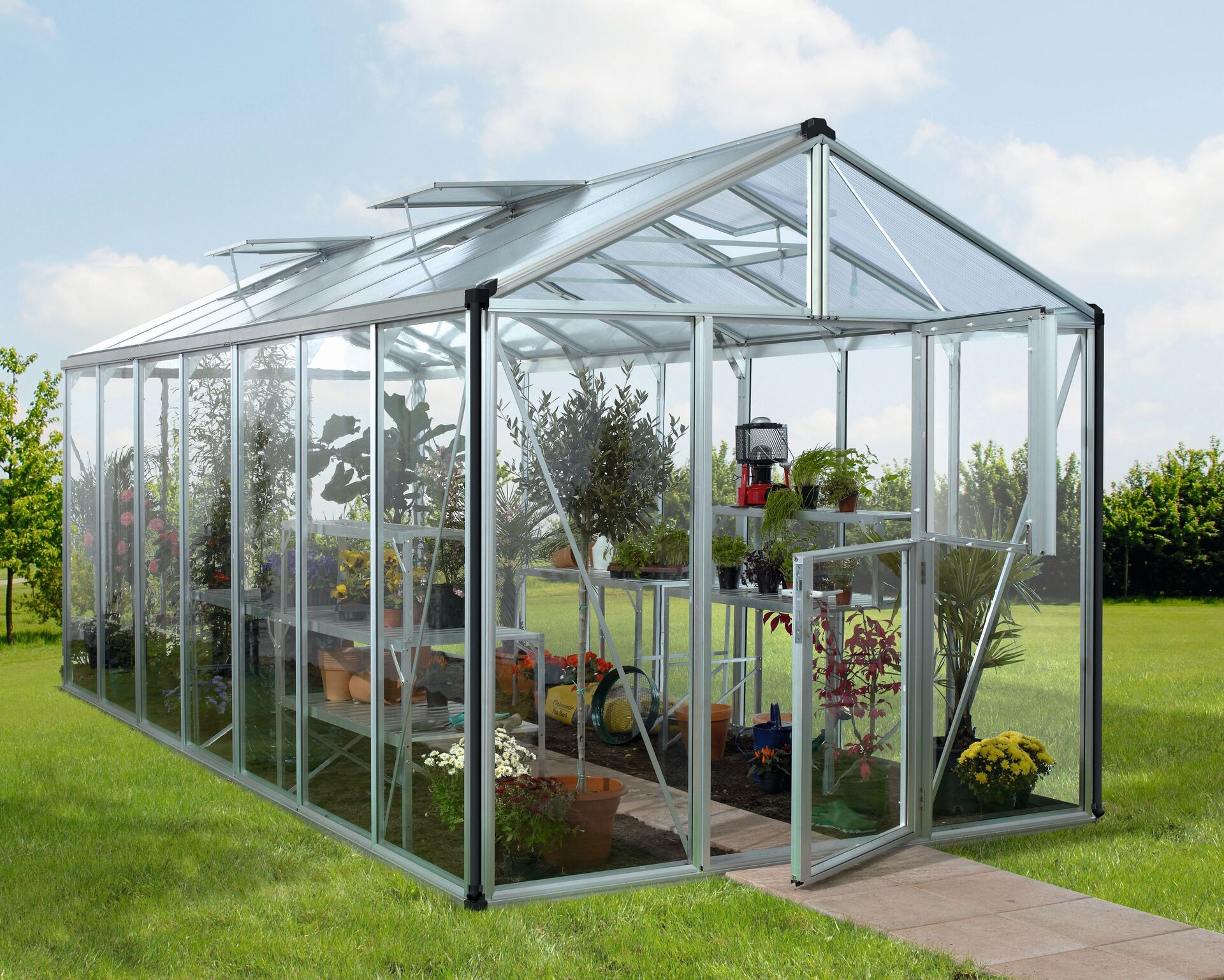 Das Zeus ist in fünf Größen und in Aluminium eloxiert sowie Schwarz (pulverbeschichtet) erhältlich. Es kann wahlweise mit ca. 3 mm starkem Einscheibensicherheitsglas (ESG) oder Hohlkammerplatten (HKP) in den Stärken ca. 10 oder 16 mm ausgestattet werden. Besonders hervorzuheben sind die außergewöhnliche Firsthöhe von 2,50 m und die extreme Traufenhöhe von 1,89 m. Dieses erstklassige Gewächshaus kann auch mit 16 mm HKP verglast werden, um für große Pflanzen mit entsprechender Beheizung einen idealen Raum zum Überwintern zu schaffen.