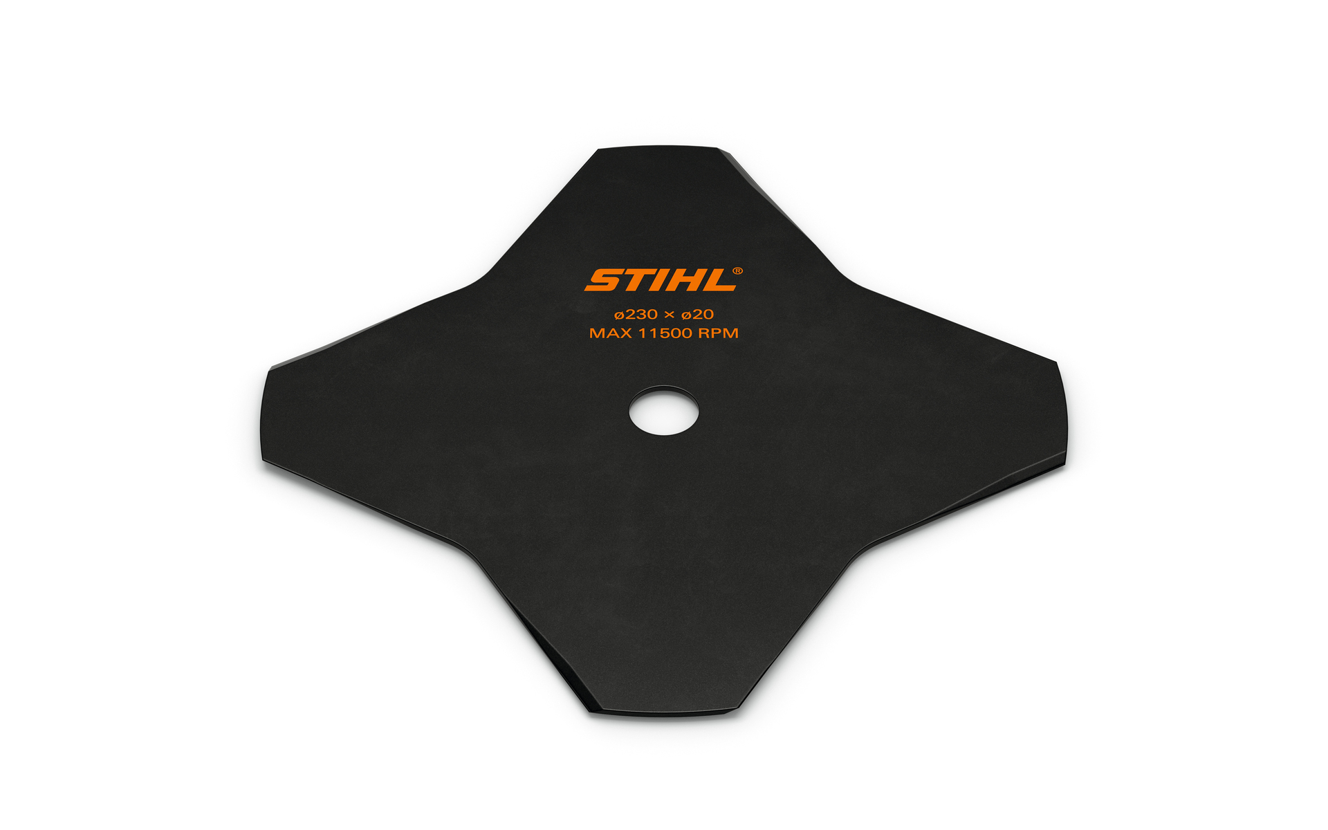 Grasschneideblatt aus Stahl mit vier Schneidkanten. Wendbar. Anwendungsschwerpunkt: Mäharbeiten in starkem, trockenem Gras, starkem Unkraut. Auch für Schilf und dünne Büsche geeignet. Nur mit Universalschutz verwenden.