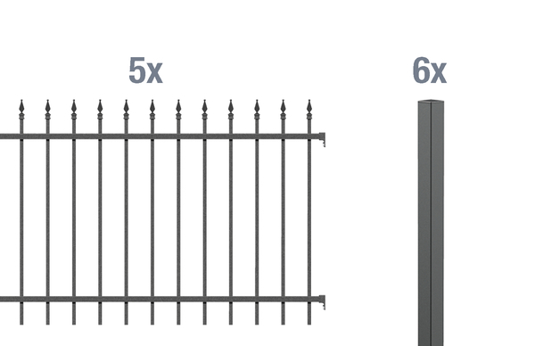 5 Zaunfeld Chaussee, Aluminium, anthrazit, 2000×1200, 6 Zaunpfosten Chaussee, Circle, Aluminium, anthrazit, zum Einbetonieren51x51/1700