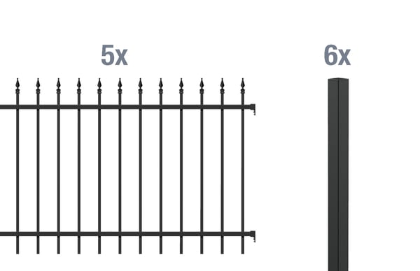5 Zaunfeld Chaussee, Aluminium, matt schwarz, 2000×1000, 6 Zaunpfosten Chaussee, Circle, Aluminium, schwarz, zum Einbetonieren51x51/1500