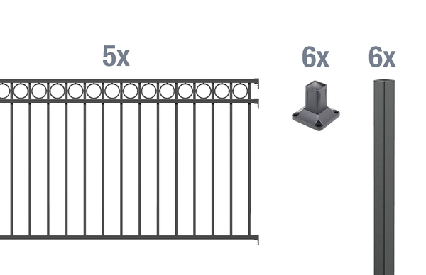 6 Zaunpfosten Chaussee, Circle, Aluminium, anthrazit, zum Einbetonieren51x51/1700, 6 Pfostenträger Chaussee, Circle, Aluminium, anthrazit, zum Aufschrauben,, 5 Zaunfeld Circle, Aluminium, anthrazit, 2000×1200