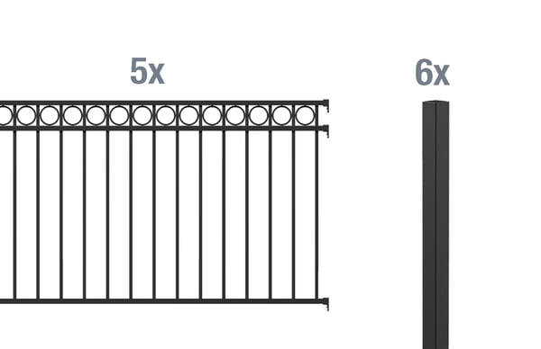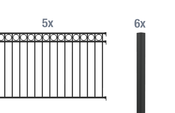 6 Zaunpfosten Chaussee, Circle, Aluminium, schwarz, zum Einbetonieren51x51/1500, 5 Zaunfeld Circle, Aluminium, matt schwarz, 2000×1000