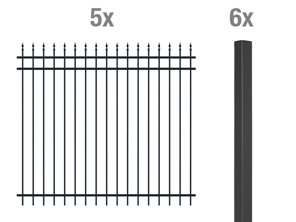 5 Zaunfeld Columbus, Aluminium, matt schwarz, 2000×1800, 6 Zaunpfosten Columbus, Aluminium, schwarz, zum Einbetonieren51x51/2400