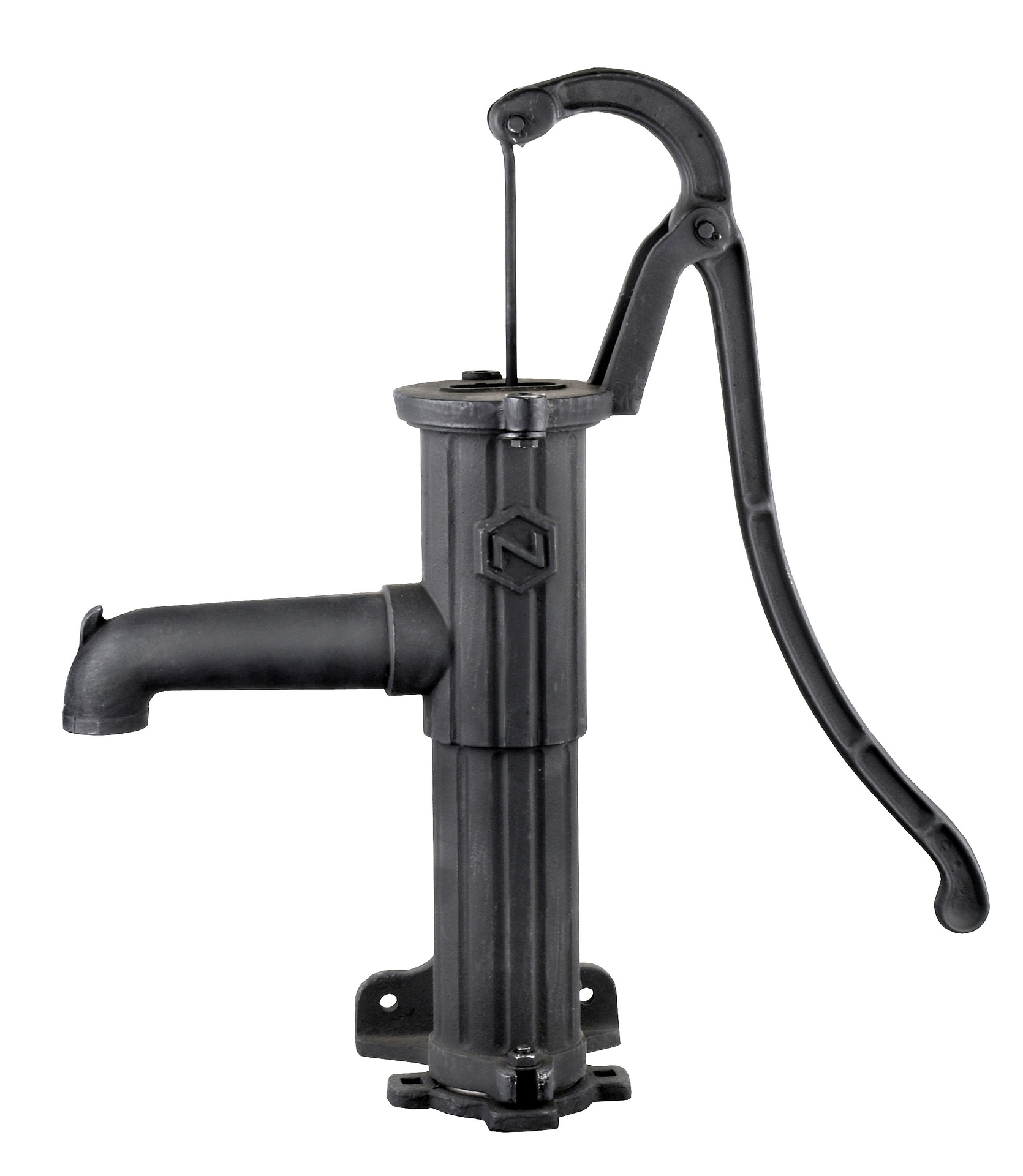 Grausguss-Handschwengelpumpe mit Seitenflansch.