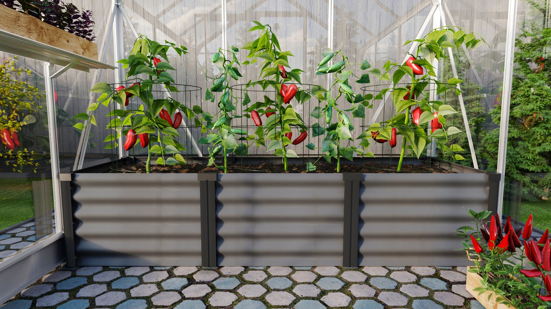 Dezent fügen sich die Hochbeete IN&OUT in den Farben Granit oder Seegras, kombiniert mit farblich abgesetzten Aluminiumprofilen (wahlweise in Aluminium eloxiert oder schwarz pulverbeschichtet) in nahezu jedes Vitavia Gewächshaus und den modernen Garten ein.