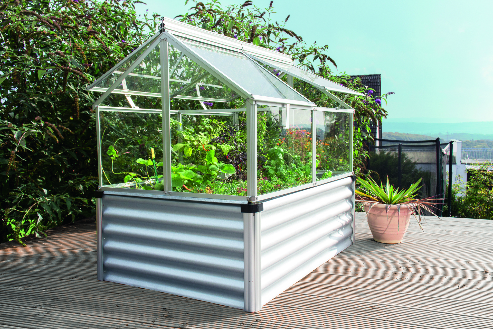 Frühbeetbausatz aus eloxierten Aluminiumprofilen mit einer Verglasung aus ca. 3mm starkem Einscheibensicherheitsglas (ESG), kristallklar und einem Hochbeet-Unterbau aus witterungsbeständigem Zincalume. Technische Daten: