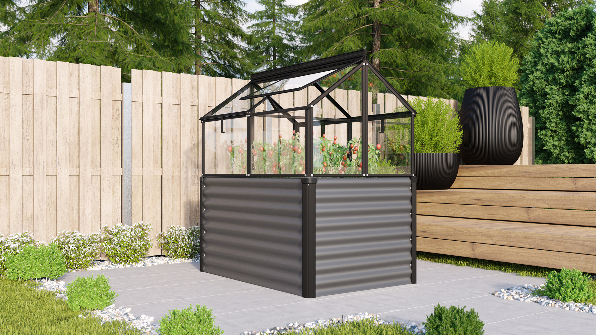 Frühbeetbausatz mit einer Eindeckung mit Hohlkammerplatten (HKP) und einem Hochbeet-Unterbau aus witterungsbeständigem Zincalume.