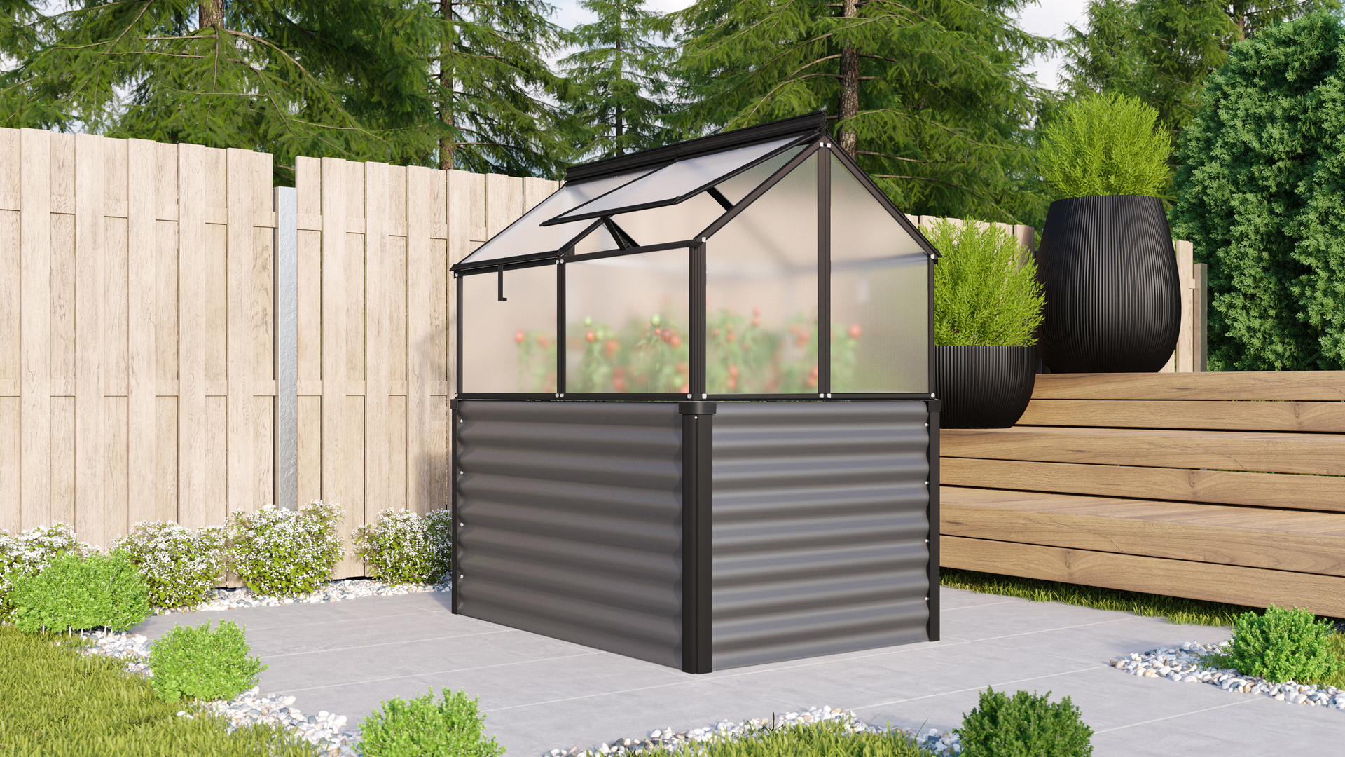 Frühbeetbausatz mit einer Eindeckung mit Hohlkammerplatten (HKP) und einem Hochbeet-Unterbau aus witterungsbeständigem Zincalume.