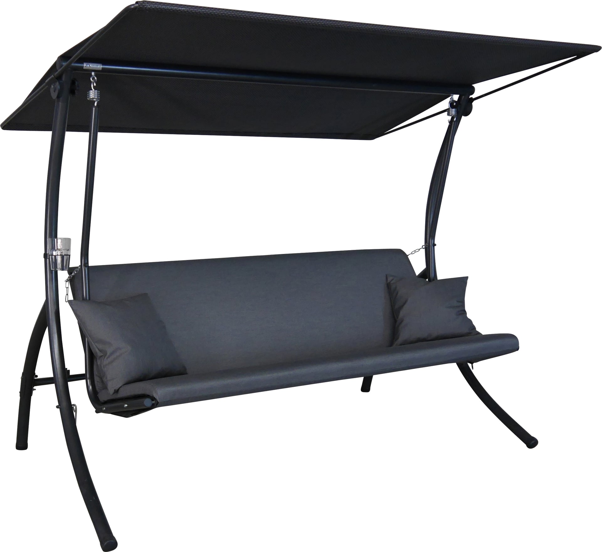 Die moderne 3-Sitzer Hollywoodschaukel Motion Zip ist mit wetterfesten Auflagen ausgestattet. Diese werden um den Sitz- und Lehnenrahmen gelegt und mit Reißverschlüssen daran befestigt, sodass diese nicht verrutschen können. Die Kissenbezüge bestehen aus einem wetterfesten Polyacryl-Stoff und sind mit einem schnelltrocknenden Schaumstoffkern gefüllt. Dank dieser speziellen Materialien können die Auflagen der Hollywoodschaukel Motion Zip auch bei schlechter Witterung und sogar bei Regen auf der Schaukel bleiben. Zwei passende Sofakissen sind ebenfalls im Lieferumgang enthalten. Das robuste Gestell der Hollywoodschaukel besteht aus verzinktem und pulverbeschichtetem Stahl. Das Sonnendach ist, aus wetterfestem Textilene Gewebe gefertigt und individuell verstellbar. Durch Vor- oder Zurückschieben oder Neigen des Daches ist stets optimaler Sonnenschutz gegeben. Ebenfalls verstellbar ist der Neigungswinkel der Lehne. Mit wenigen Handgriffen kann diese komplett zur Liegefläche abgeklappt werden. Der Sitz- und Lehnenrahmen besteht aus einem witterungsbeständigen Kunststoff und ist bereits werksseitig vormontiert, sodass der Zusammenbau der Hollywoodschaukel kinderleicht ist. Zur Selbstmontage, inkl. Montageanleitung. Made in Germany. In verschiedenen Farben erhältlich.