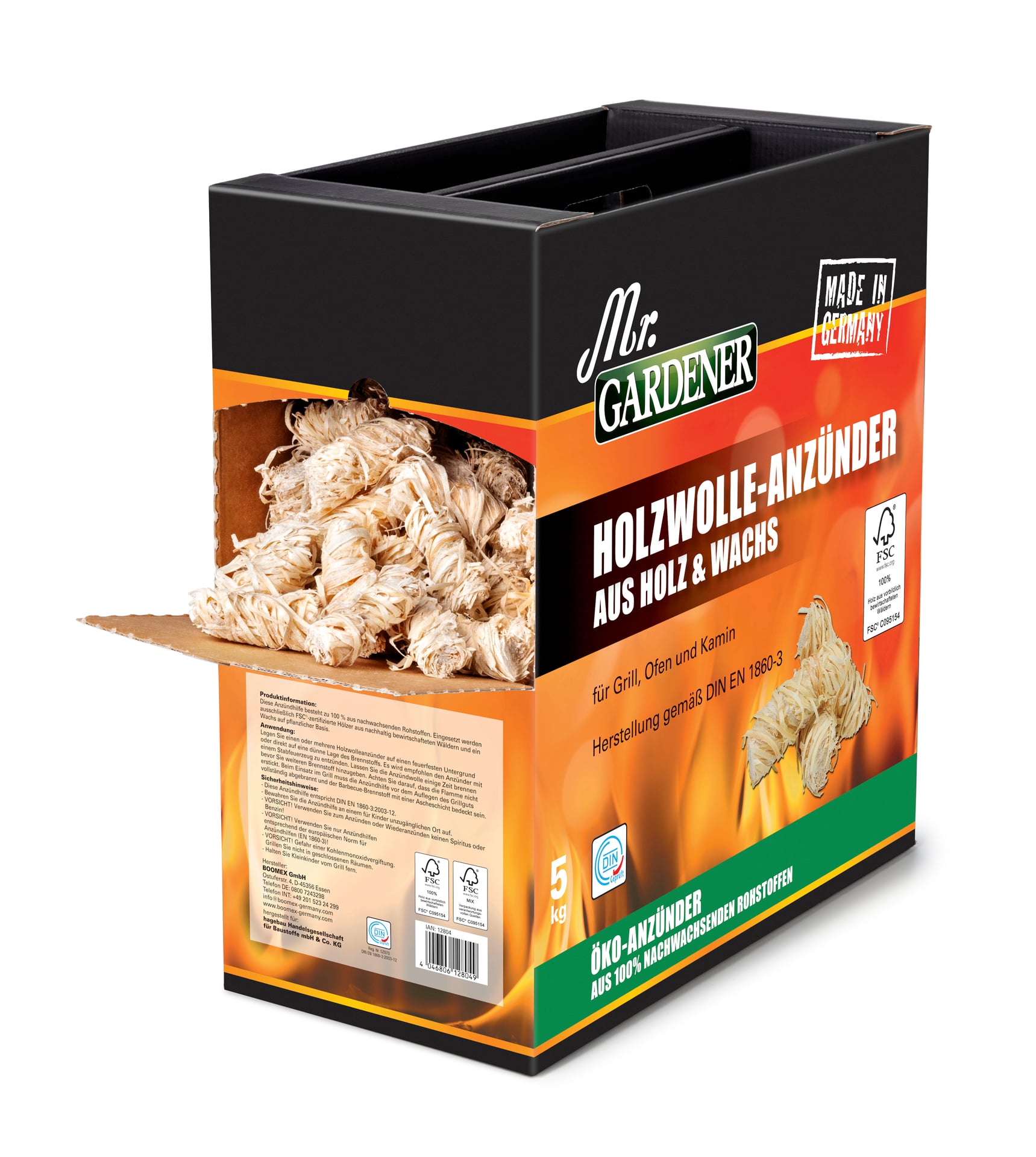 Öko-Anzündwolle aus Naturholz und pflanzlichem Wachs zum sicheren, geruchsarmen und sauberen Anzünden von Grill, Ofen und Kamin.