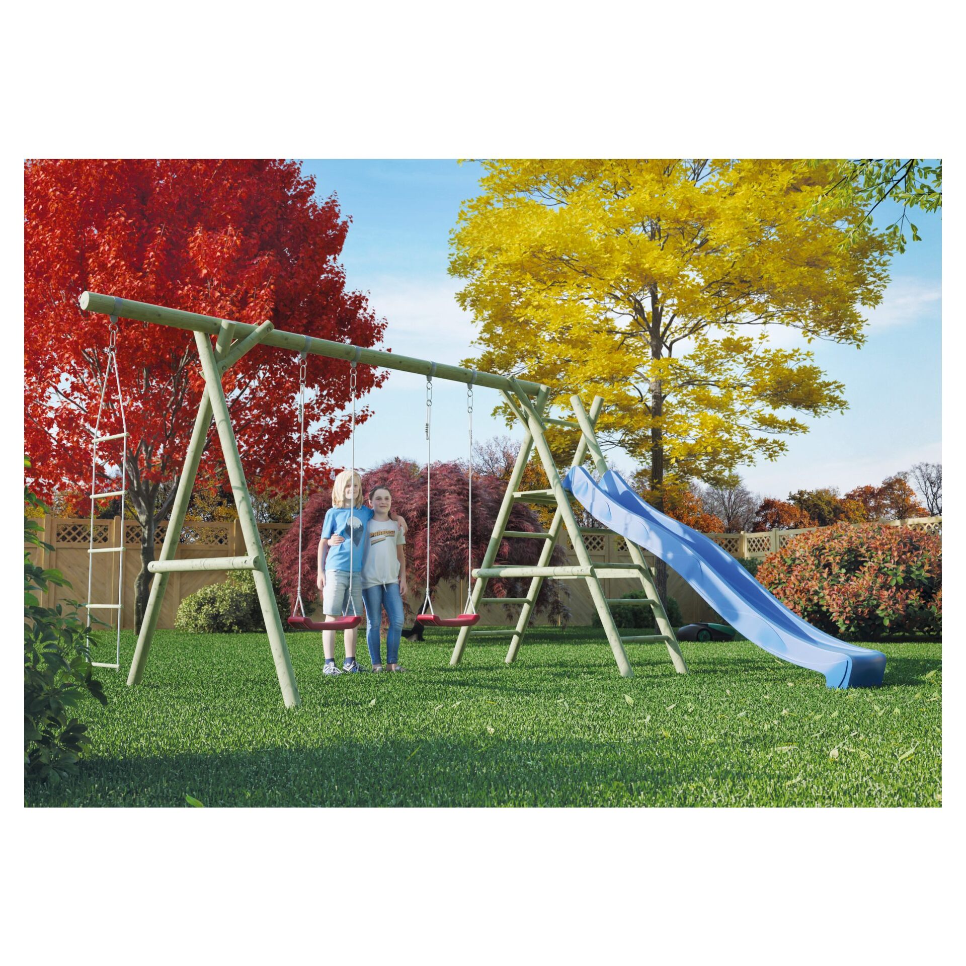 JUSTUS-Spielanlage: kompletter Bausatz aus Rundholz 8 cm und 10 cm, inkl. zwei Schaukelbretter mit Schaukelschellen, einer Strickleiter und Montagematerial, Podesthöhe 145 cm, ohne Wellenrutsche; für mehr Standsicherheit: Erdanker – gleich 4 Stück mitbestellen Achtung: Biozidprodukte vorsichtig verwenden. Vor Gebrauch stets Etikett und Produktinformationen lesen. Achtung: Nicht geeignet für Kinder unter 3 Jahren. Benutzung unter Aufsicht von Erwachsenen. Achtung: Nur für den Hausgebrauch.