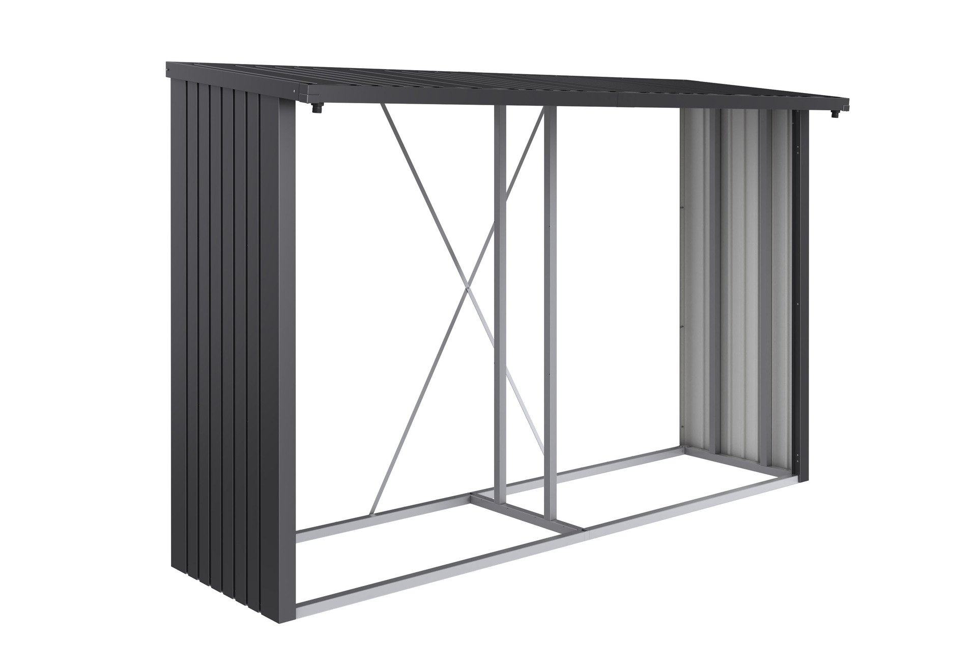 – Breite: 3007, – Farbe: dunkelgrau-metallic, – Gewicht: 54,7, – Höhe: 1990, – Länge: 1020, – Material: Stahl, – Produktart: Holzlager