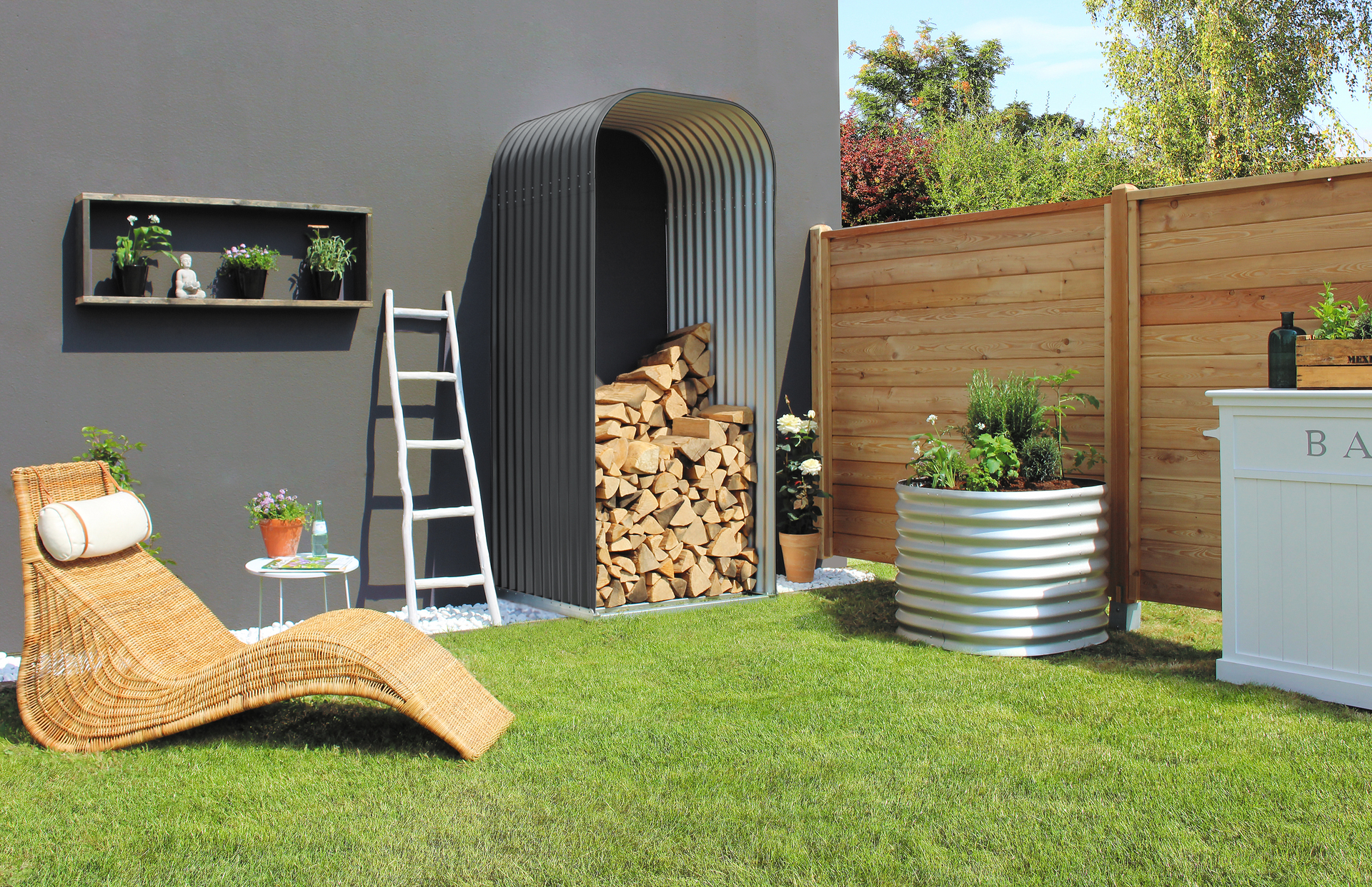 Kaminholzregal-Bausatz aus witterungsbeständigen Zincalume-Blechen inklusive einer Unterkonstruktion aus eloxierten Aluminiumprofilen.
