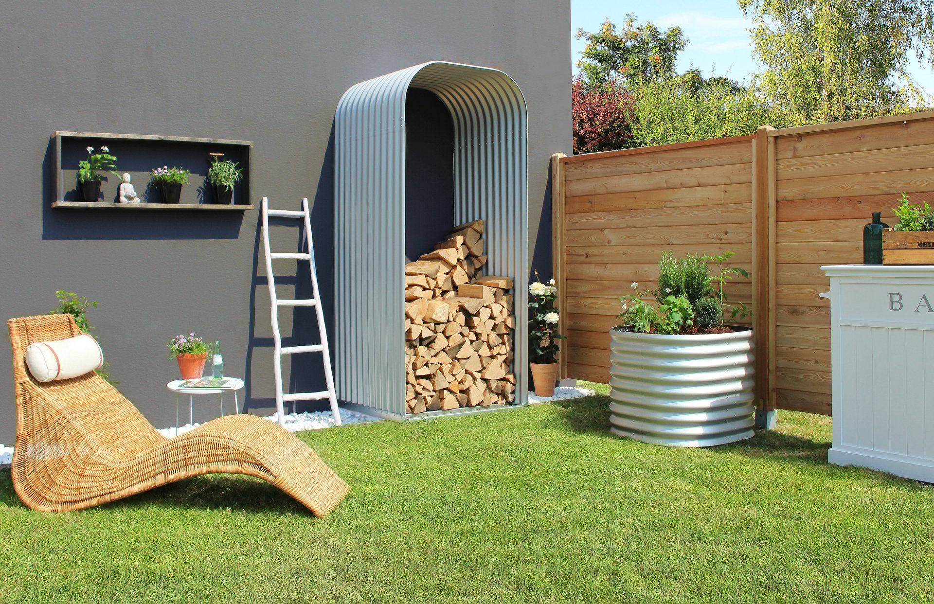Kaminholzregal-Bausatz aus witterungsbeständigen Zincalume-Blechen inklusive einer Unterkonstruktion aus eloxierten Aluminiumprofilen.