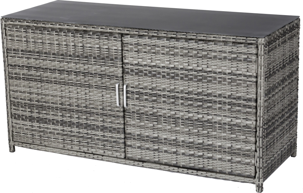 Schöne Aufbewahrungsmöglichkeit für den Außenbereich. Aluminiumgestell, Kunststoffgeflecht “black pearl”, mit 2 Türen. Ca. B 160 x H 83 x T 62 cm. Mit Struktur-Sicherheitsglasplatte