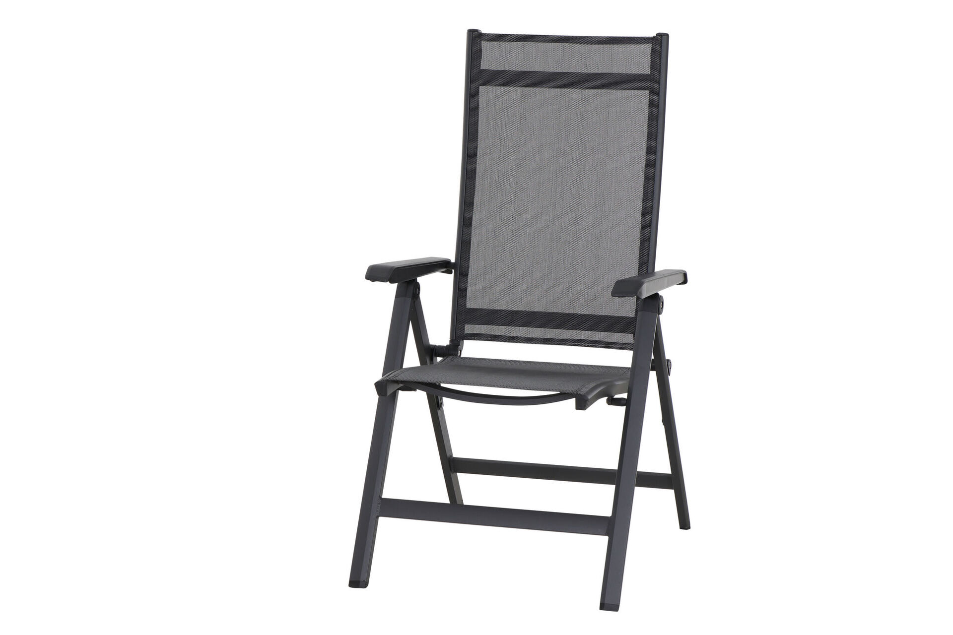 Das stabile Gestell aus pulverbeschichtetem Aluminium in mattem Anthrazit sorgt für eine elegante Optik und ist zugleich besonders witterungsbeständig. Die schwarzen Kunststoff-Armlehnen bieten zusätzlichen Komfort und fügen sich harmonisch ins Gesamtbild ein.