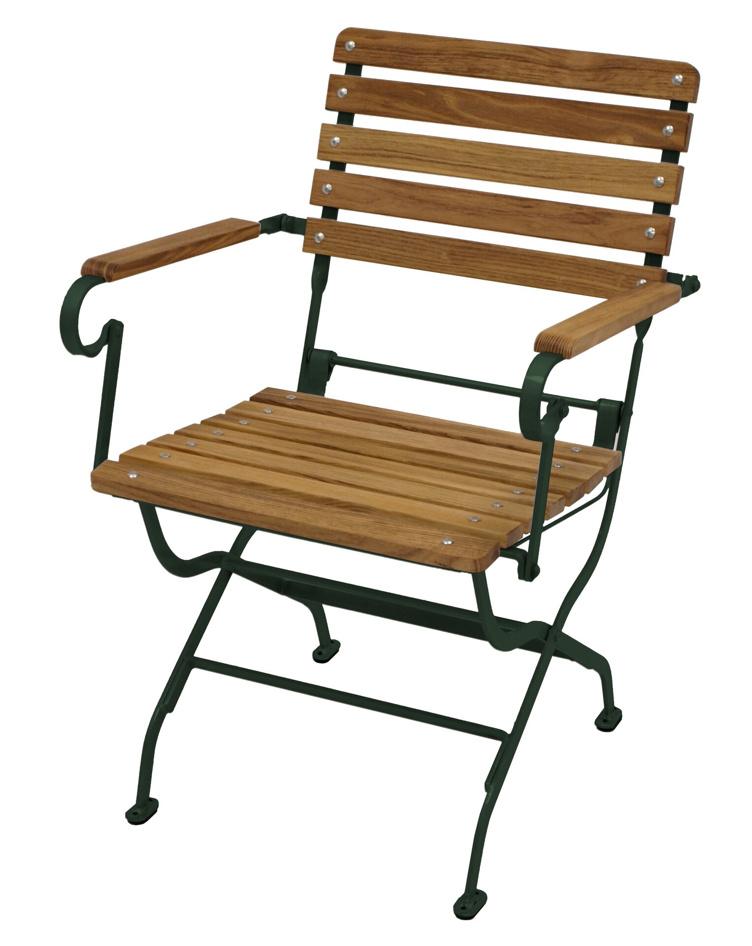 Armlehnensessel, klappbar, Gestell Flachstahl dunkelgrün pulverbeschichtet, Belattung Robinienholz. Kunststoff-Bodenschoner an den Fußplatten.
