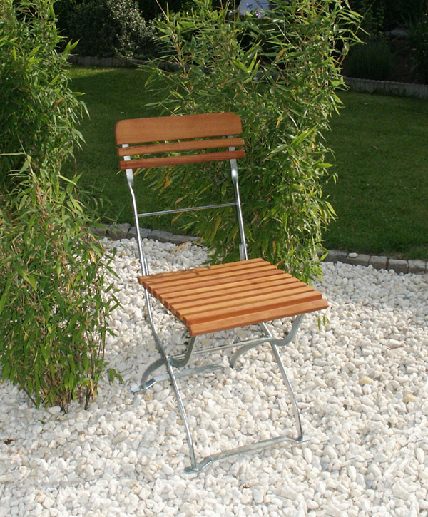 Klappbare Gartenstühle ohne Armlehnen im klassischen Biergartendesign.